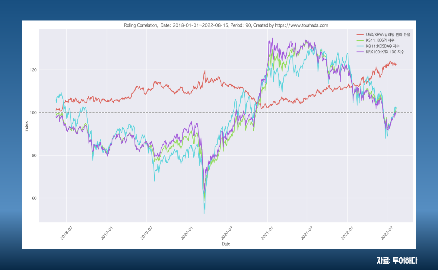 - 비교대상: 원달러환율과 국내 코스피지수, 코스닥지수, KRX100 지수