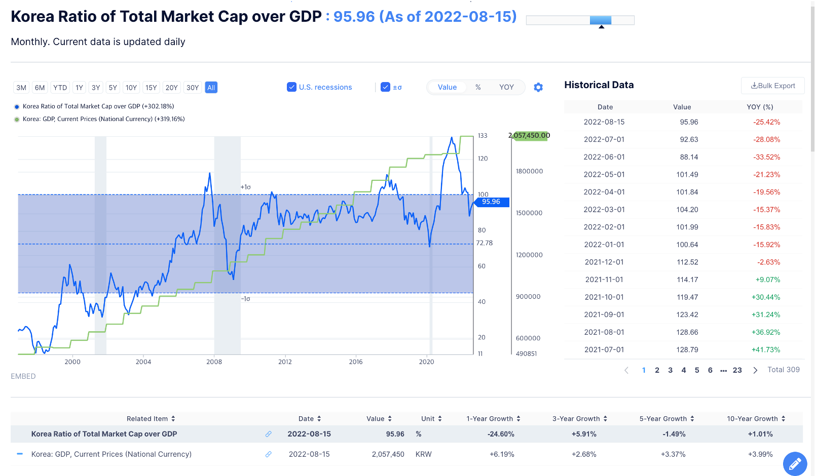 @한국 버핏지수: 95.96%(2022년 8월 15일 한국시간 기준), @미국 버핏지수: 182.52%(2022년 8월 1일 미국시간 기준)