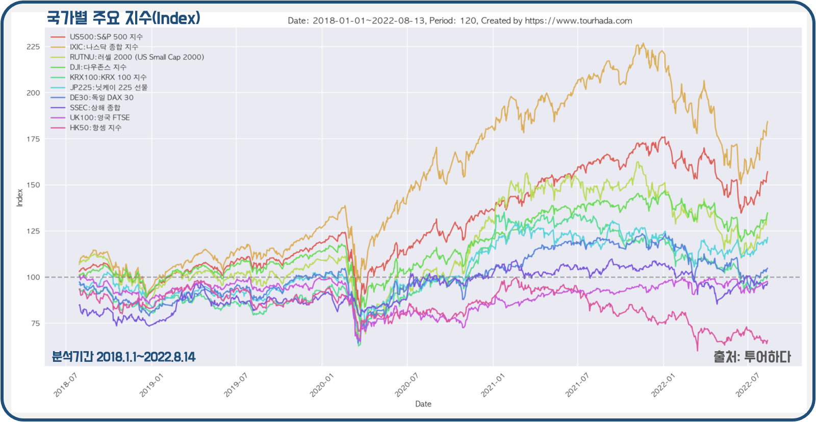 ▶️  2022년 러시아-우크라이나 사태로 인한 원유와 천연가스 원자재 공급부족으로 인한 지수 하락이 일어났으며, 인플레이션을 잡기위한 테이퍼링 정책들을 수행하기 위해 기준 금리상승이 대부분의 국가들의 주요지수가 하락전환하였습니다.
