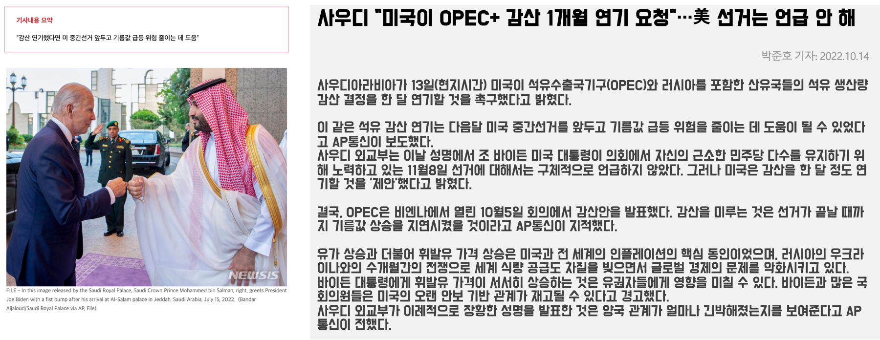 사우디 "미국이 OPEC+ 감산 1개월 연기 요청" 美 선거는 언급 안 해 (자료: NEWSIS)