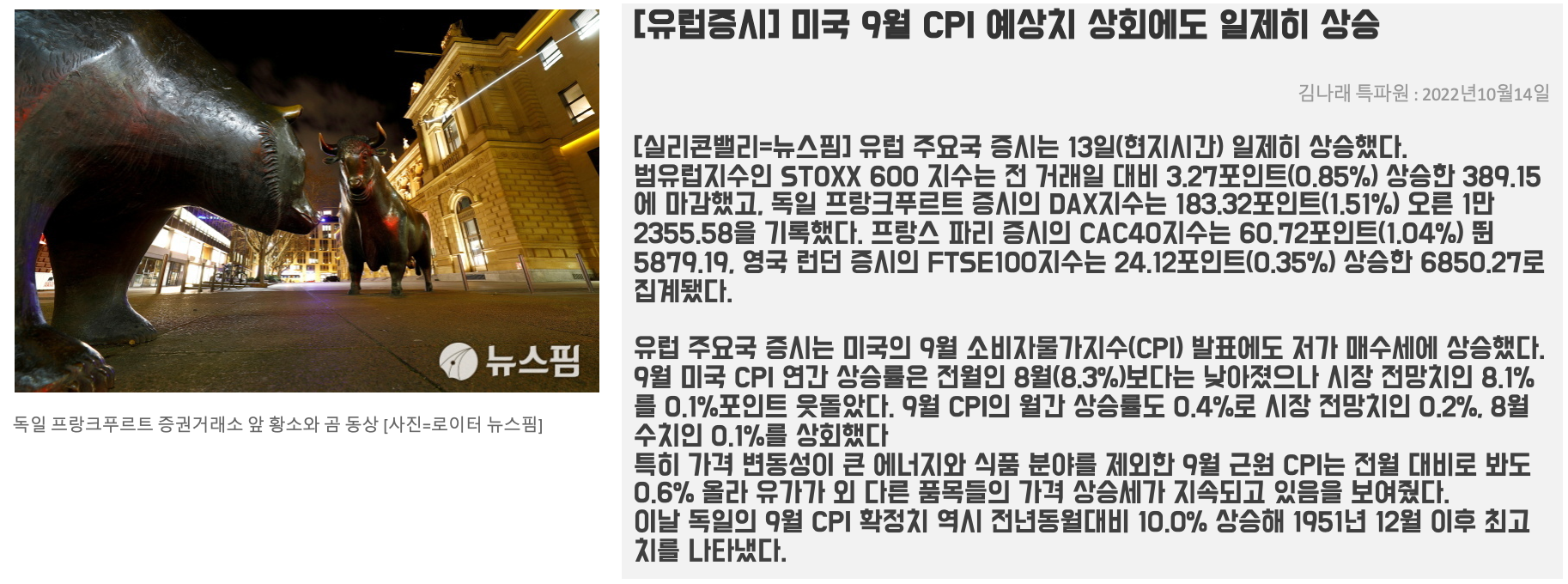 [유럽증시] 미국 9월 CPI 예상치 상회에도 일제히 상승 (자료: 뉴스핌)