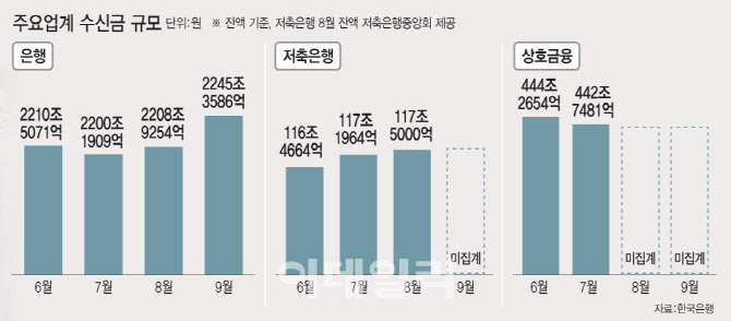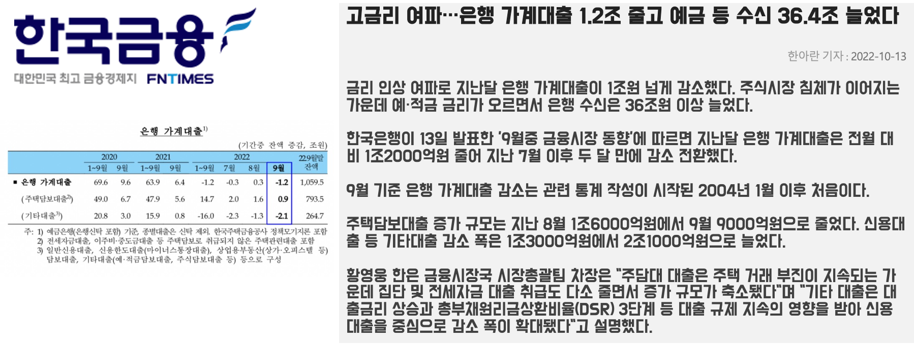 고금리 여파…은행 가계대출 1.2조 줄고 예금 등 수신 36.4조 늘었다 (자료: 한국금융)