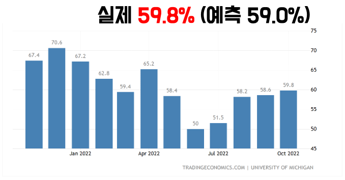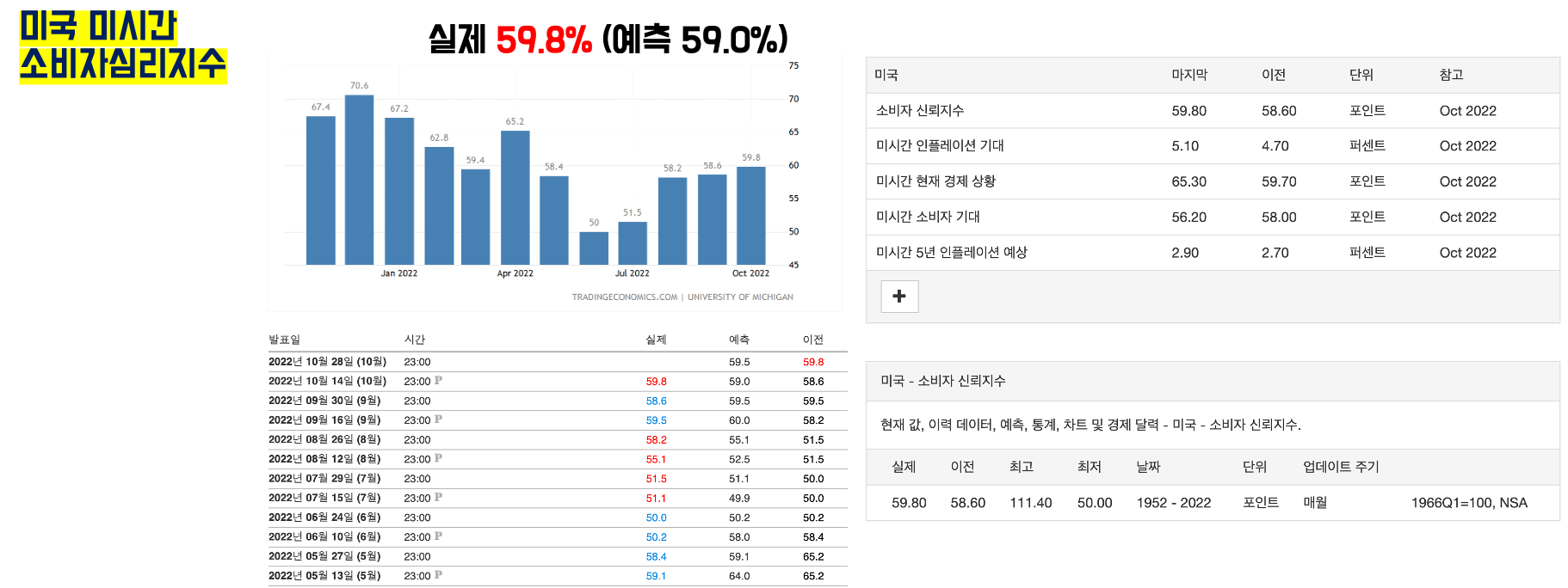 미국 미시간 소비자심리지수 CSI는 지난달 9월 30일 발표에는 58.8%였고, 이번 10월 14일 발표에서는 예측치가 59.0% 였던것보다 소폭 상승한 59.8% 로 올랐습니다. 소비심리가 긍정적으로 나온만큼 경기 활성화나 미국 달러가치에도 긍정적인 영향을 미칠것으로 보입니다.