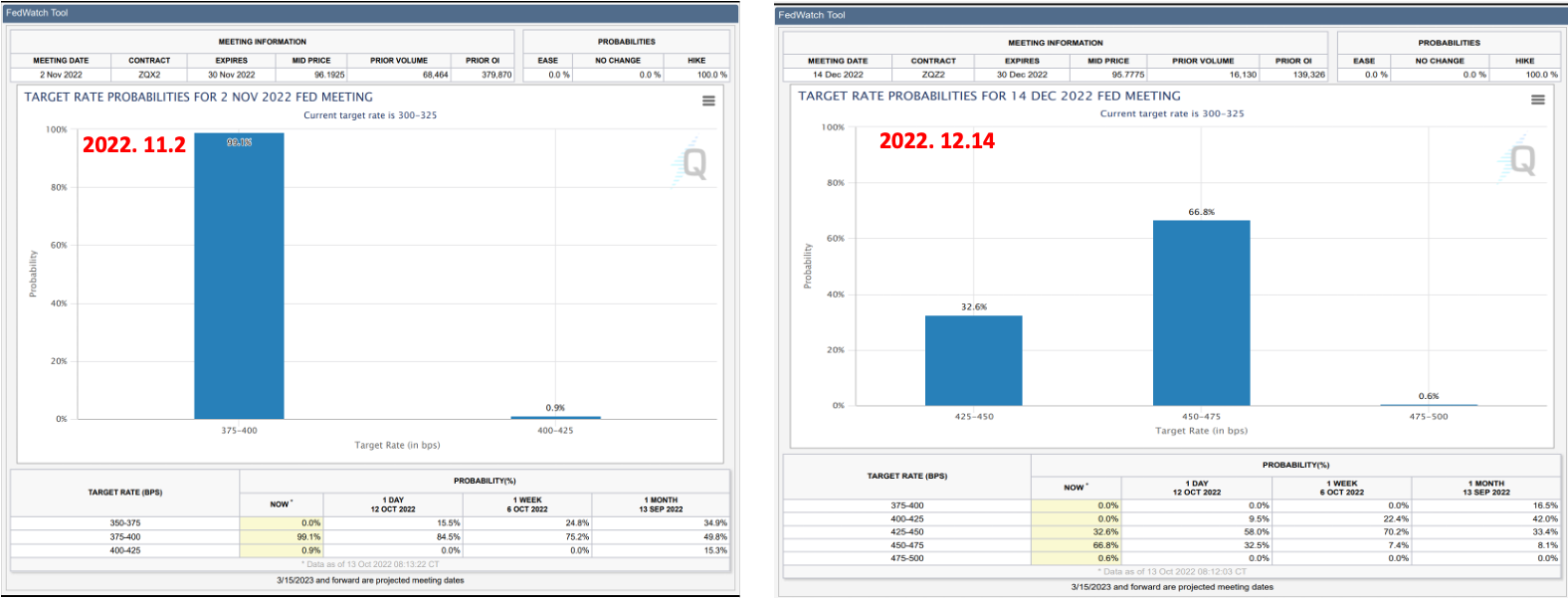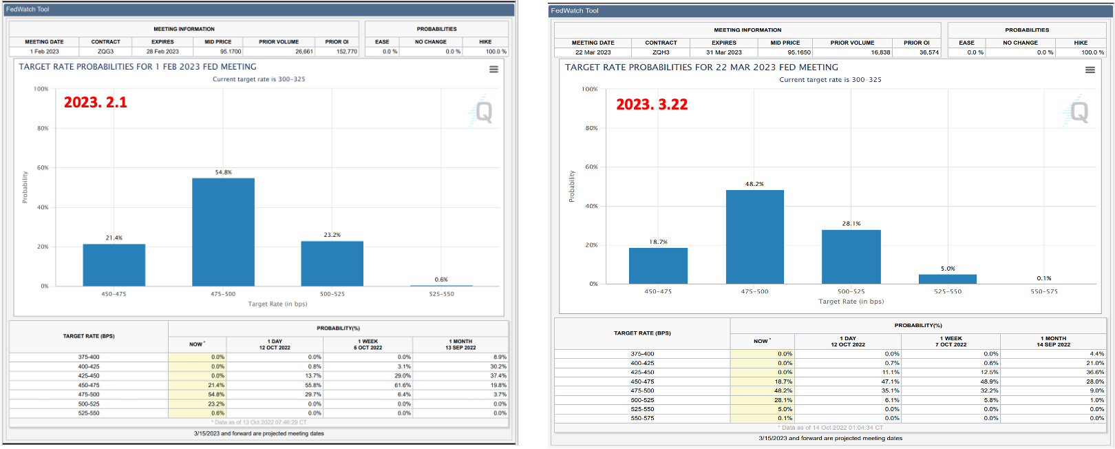 경제지표 발표와 관련해서 미국 주가는 14일 급반등 상승 마감했지만, 미국 기준금리 예상은 FedWatch에 조사 결과에 의하면 앞으로 지속적인 상승이 이루어져 내년 3월에는 5%대 금리까지 오를 것이라는 예상 결과가 나왔습니다.