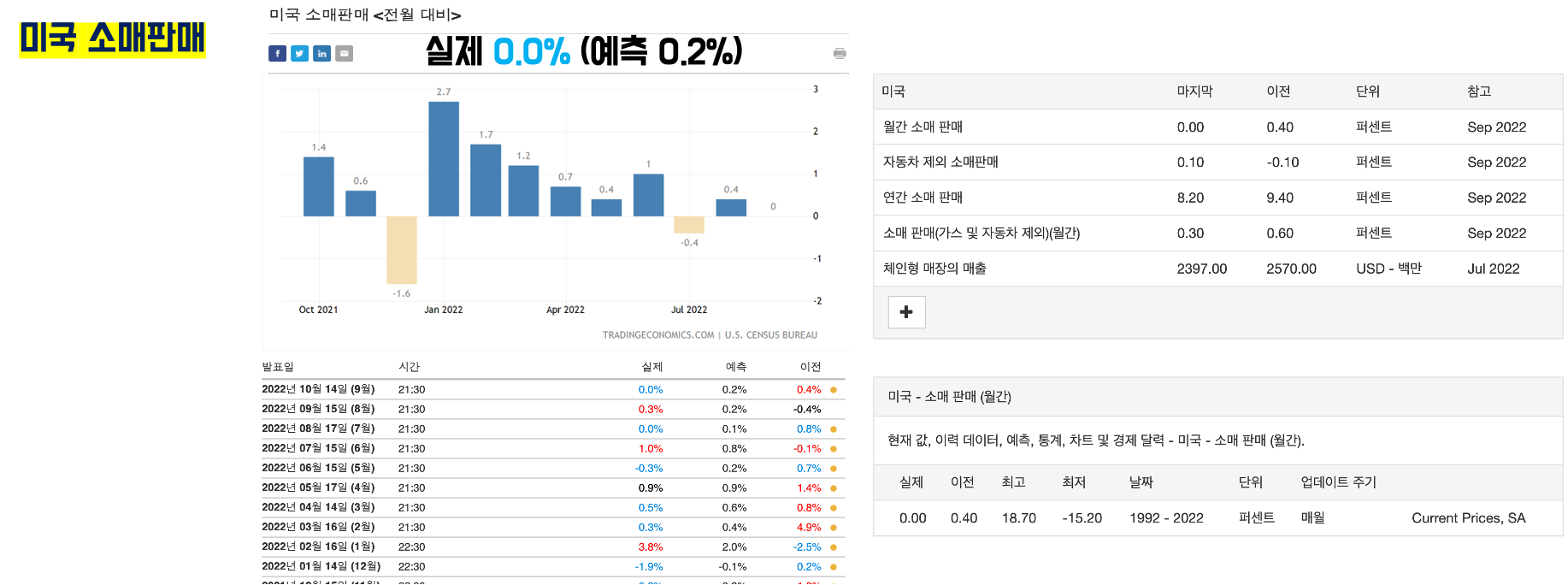 미국 소매판매 지수는 전월 대비로 비교하는데 한국시간 기준 2022년 10월 14일 저녁 9시 30분에 발표합니다.