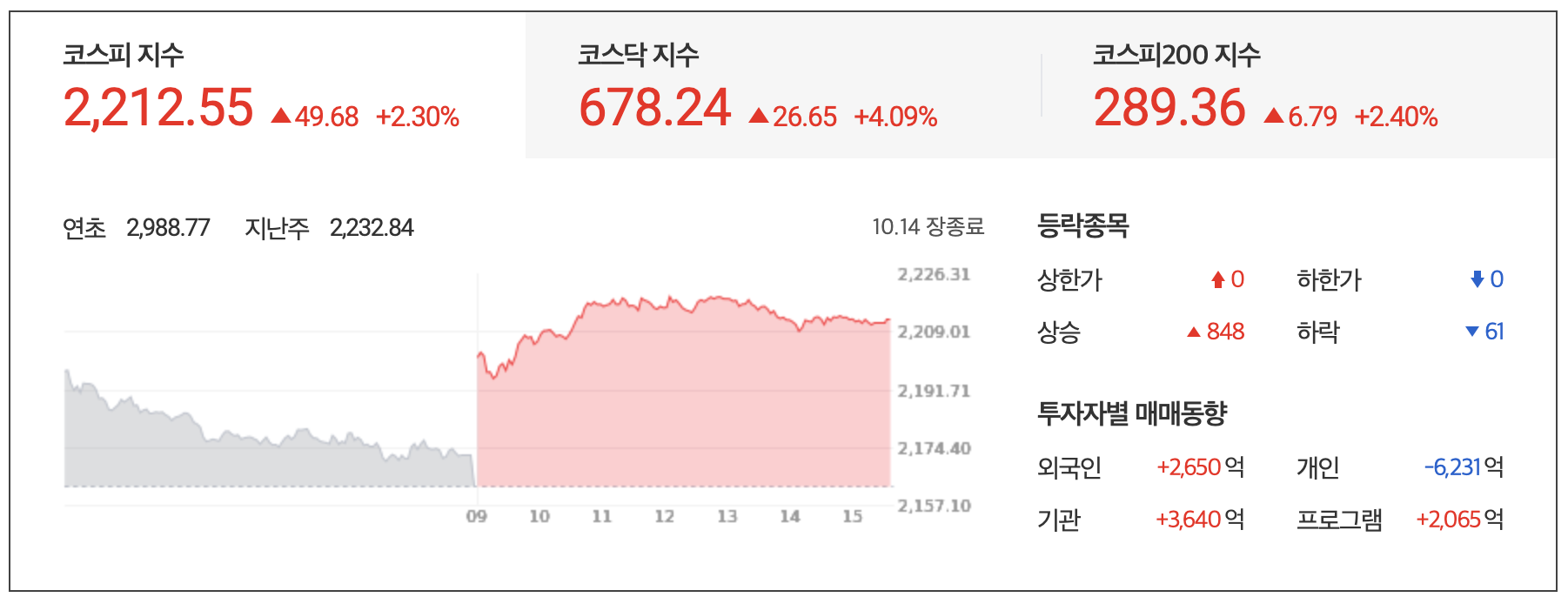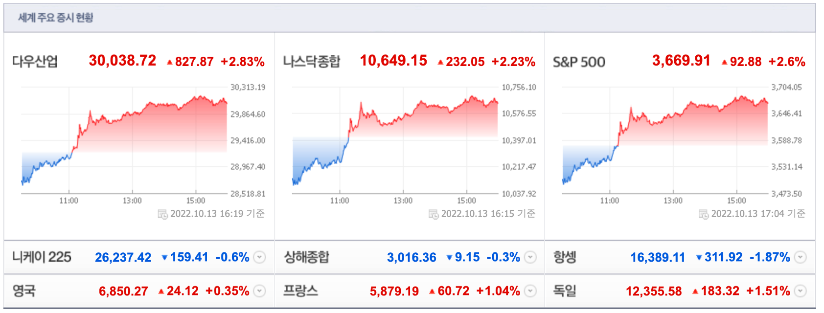 미국 증시와 경제지표인 다우산업지수, 나스닥종합지수, S&P500 지수등 한국 시간 10월 13일 밤 9시 30분까지는 급하락하면서 고전을 면치 못하다가 밤 11시 30분 기점으로 증시가 반등하기 시작하면서 새벽부터는 나스닥 관련 기술주 뿐만아니라 반도체 필라델피아 지수등 일제히 미국 주가가 급반등 상승 마감했습니다.