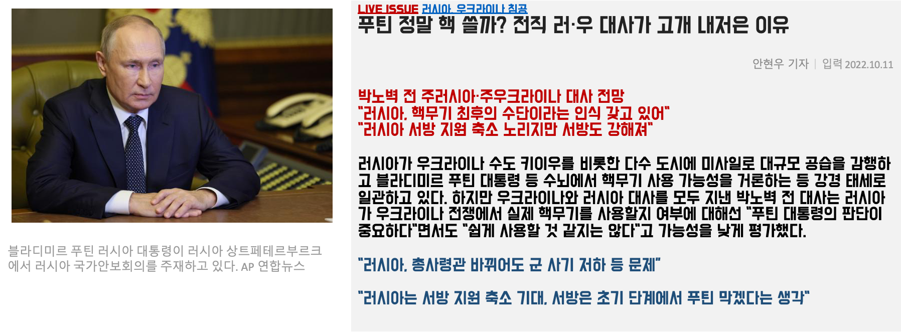 푸틴 정말 핵 쓸까? 전직 러·우 대사가 고개 내저은 이유