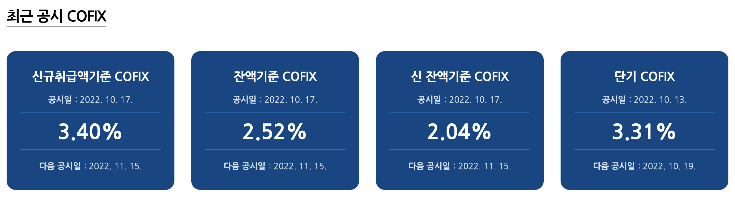 우리나라 기준금리 결정기준은 코픽스(COFIX)의 영향을 가장 많이 받는것으로 알려졌는데, 지난 10월 17일 코픽스가 3.4%로 상승 발표 되었습니다