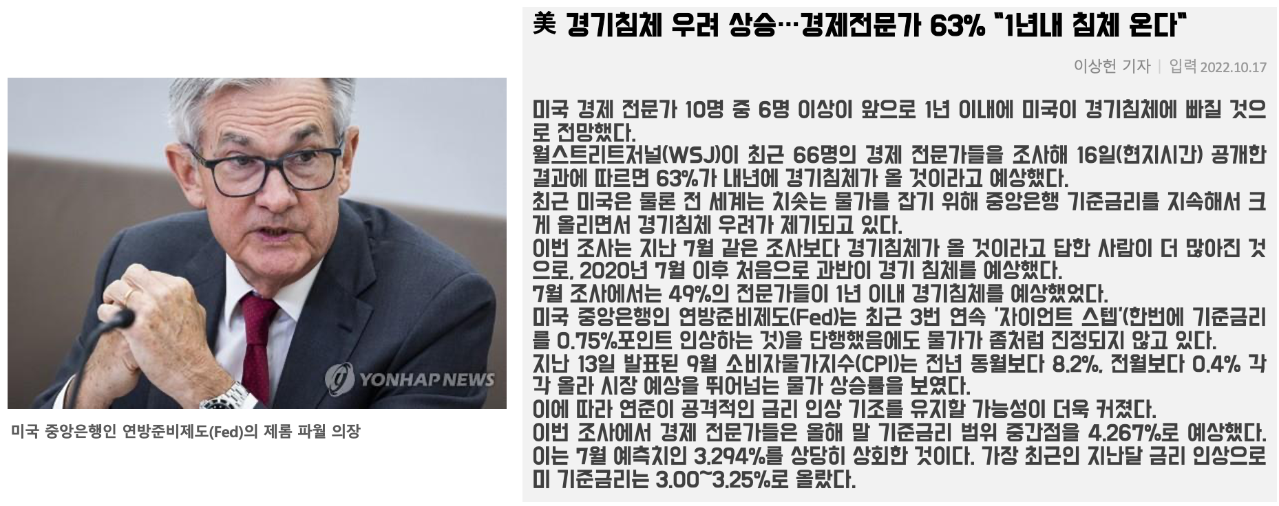 인플레이션이 잡히지 않고 있는 가운데 지난번 9월 소비자물가지수가 8.2%로 예상치보다 높게 발표(10월 14일)되면서, 미국 중앙은행인 연방준비제도(Fed)는 11월 기준금리 인상을 앞두고 한번더 자이언트스텝 75bp 올린 4.0% 발표할 것이라는 전망이 유력해 졌습니다. 이에 따라 경제전문가들 중에 63%가 1년이내 경기 침체가 올것이라는 전망입니다.