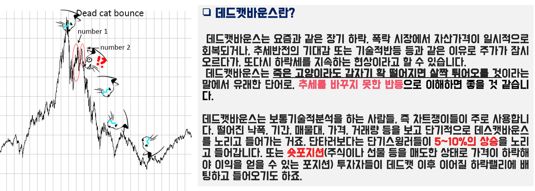 데드캣 바운스 의미는 죽은 고양이가 일시적으로 튕겨 올랐다가 떨어지는 현상을 증권 시장에서 추세가 일시적 반등후 급 하락할 때를 나타내는 표현입니다.