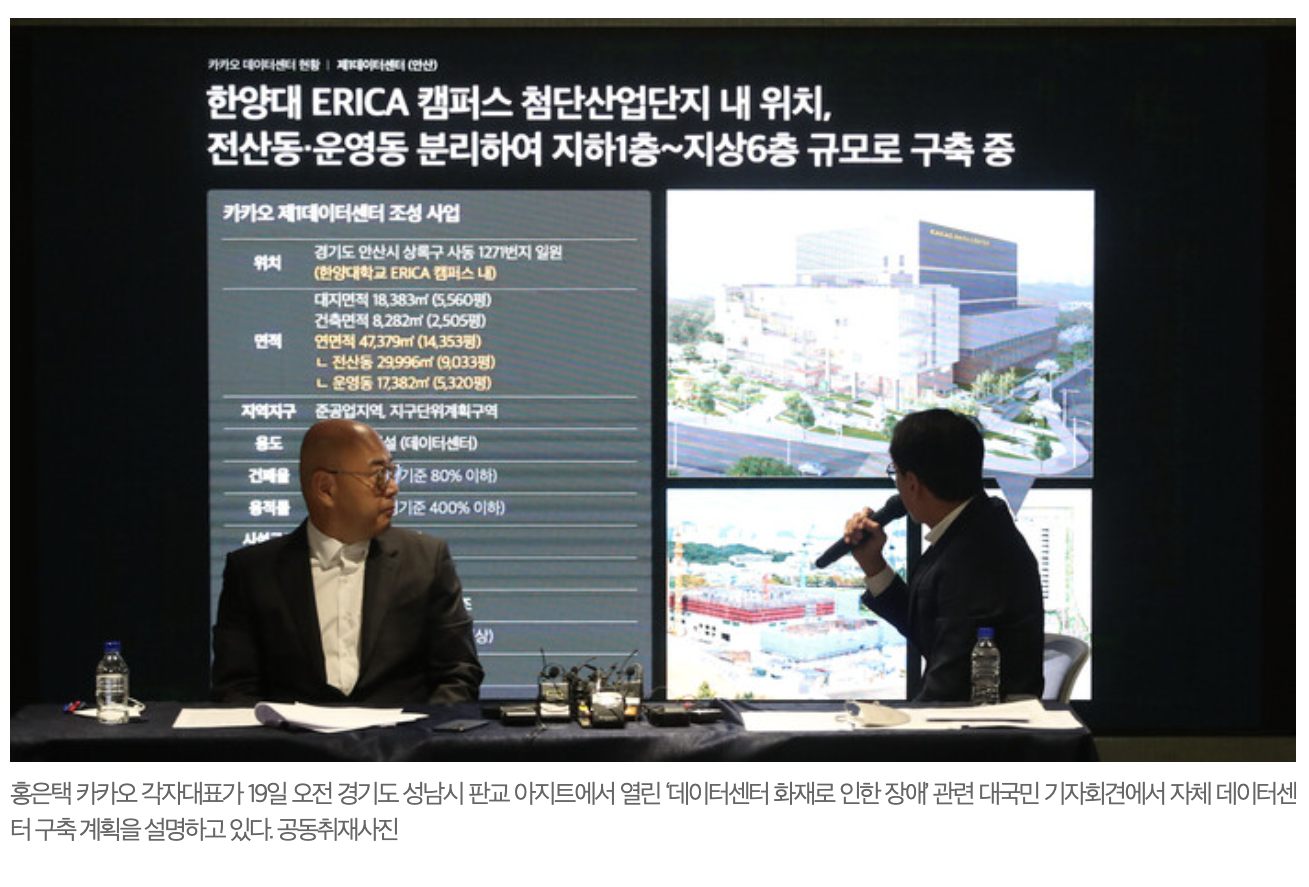 홍 대표는 “카카오 서비스 운영에 필요한 전체 서버 9만여대를 네 군데에 나눠 놓고 사고 시 서로 백업하는 시스템을 갖췄지만, 판교 데이터센터가 전체 서버의 30% 가량을 둔 메인 센터라서 피해도 크고 복구 속도도 느렸다”며 “데이터센터 자립이 가장 중요하다고 보고, 4600억원을 투입해 경기도 안산과 시흥 두 곳에 자체 데이터센터를 준비하고 있다”고 말했습니다. 카카오에 따르면, 2023년 9월에 완공돼 2024년 1월 개통 예정인 안산 제1데이터센터에는 서버 12만대 가량을 설치할 수 있습니다. 시흥 제2데이터센터는 2024년 1월 착공 예정입니다.홍 대표는 “자체 센터 구축 전에도 추가 데이터센터를 최대한 빨리 확보하고, 현재 운영 중인 데이터센터 네 곳 이중화를 마무리하겠다. 1센터와 2센터도 전용구로 연결해 사고 시 서로 쉽게 백업하도록 하겠다”고 말했습니다.