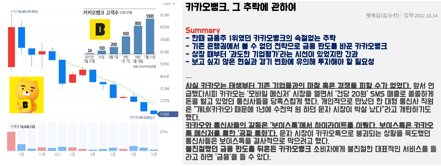 데이터 센터 화재가 발생하기 전부터 여러 증권 분석 전문가들이 카카오와 카카오 뱅크 주가 추락에 관해 관련한 보고서가 이미 나왔지만, 이번 사건을 통해 또한 번 바닥에 빠진 주가가 지하까지 내려갈 수 있음을 확인한 계기가 되었습니다.