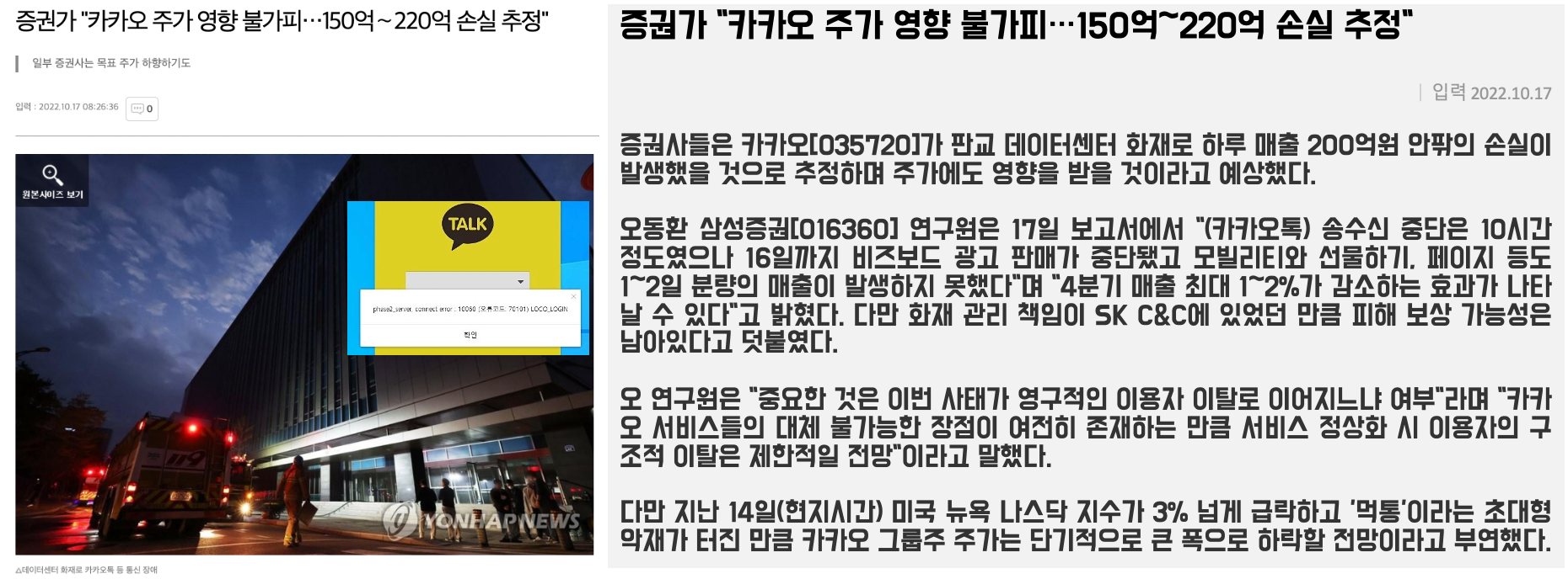 증권가 "카카오 주가 영향 불가피…150억∼220억 손실 추정"