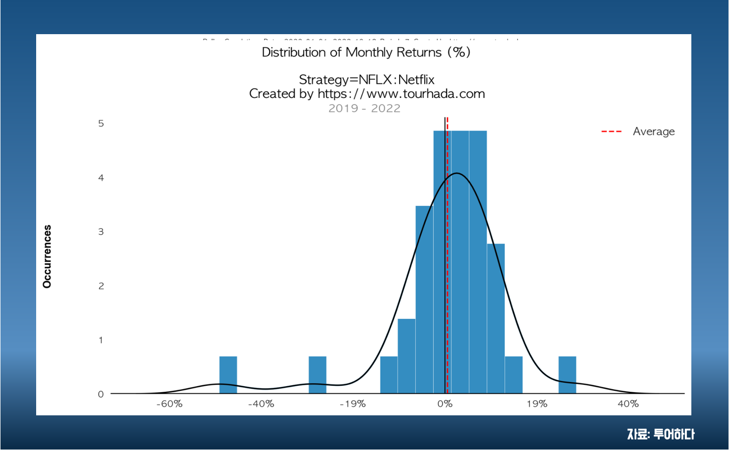 넷플릭스 월별 수익률 정규분포를 보면 평균이 왼쪽에 있고 중앙값이 오른쪽으로 치우쳐진 곡선형태인 것으로 보아, 3년간 수익률이 나쁘지 않다고 볼 수 있겠습니다.