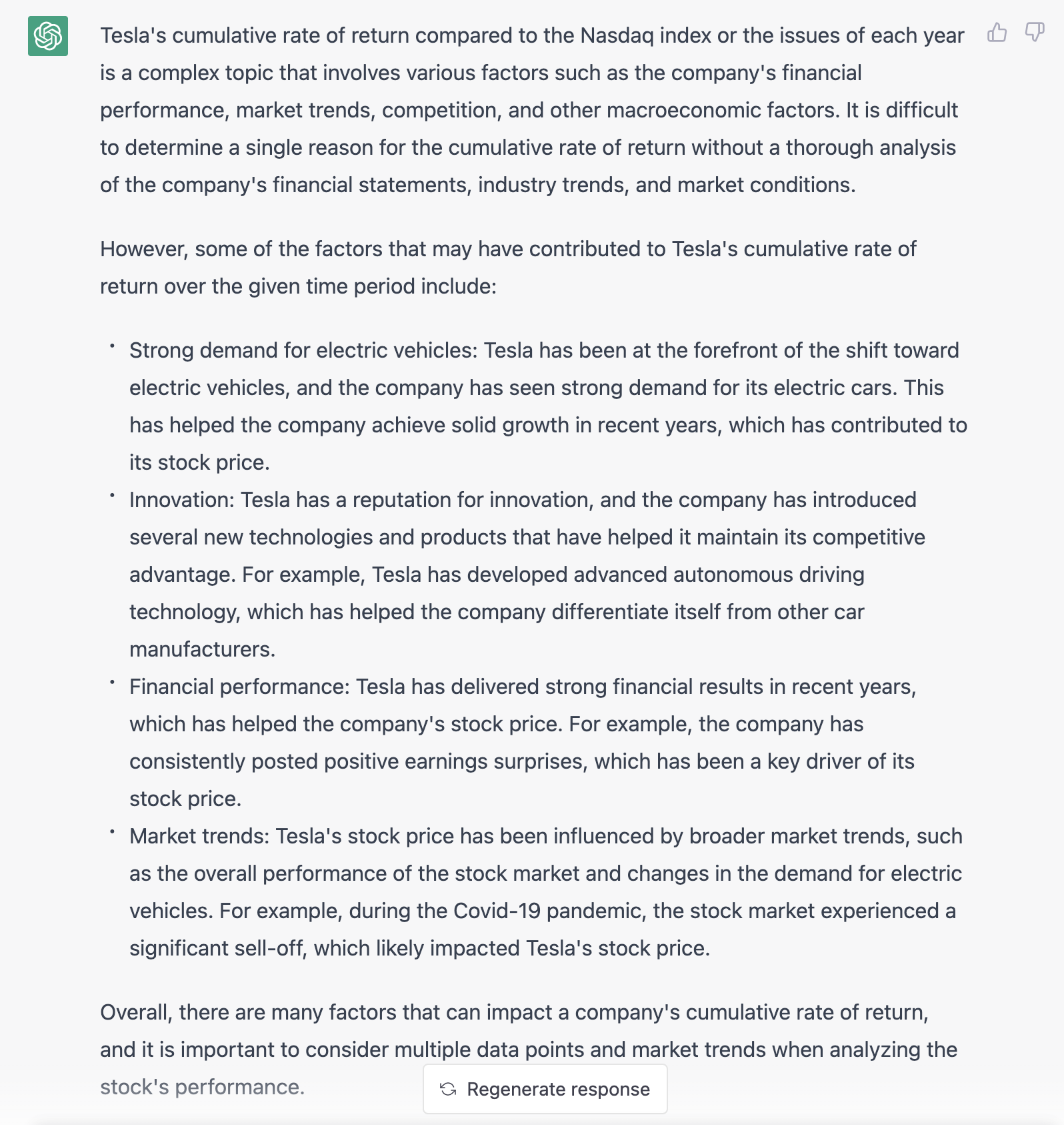 However, some of the factors that may have contributed to Tesla's cumulative rate of return over the given time period include: