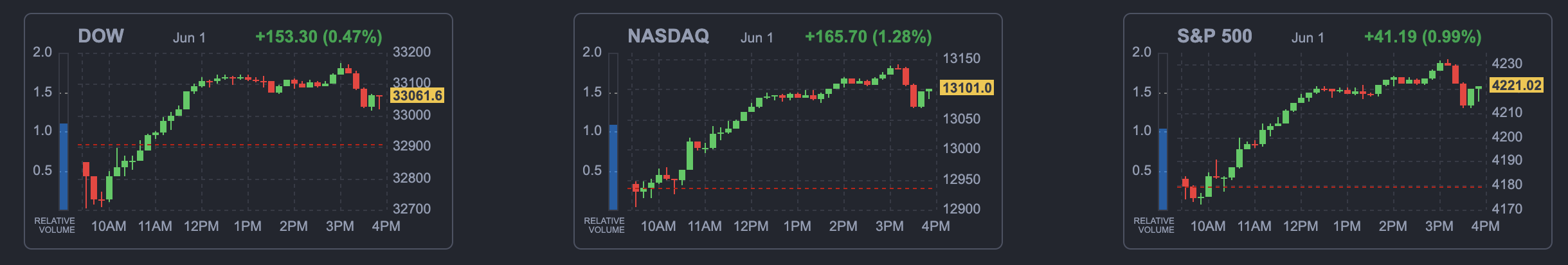 국내 증시는 혼조세로 마감했다. 코스피는 반도체 기업 약세에 0.31% 하락했고, 코스닥은 바이오 기업들의 주가 상승에 힘입어 0.80% 올랐다. 코스피 시가총액 상위 10개 종목 가운데 6개 종목이 하락 마감했다. 미국 증시에서 주요 반도체 기업들의 주가가 하락한 영향으로 삼성전자는 0.70% 내렸다. 김석환 미래에셋증권 연구원은 “5월 국내 수출 지표 부진과 미국 증시 하락이 코스피에 부담으로 작용했다”라면서 “반도체 기업들은 수출 부진에 차익 매물 출회가 증가했다”라고 분석했다. 코스닥 시총 상위 종목들은 대체로 상승 마감했다. 가상자산 시장에서는 비트코인이 1.17% 내리며 2만6838달러를 기록했다. 미국 증시에서는 주요 반도체 기업들의 주가 하락으로 다우존스30산업평균지수는 0.41% 하락한 3만2908.27로 거래를 마쳤다. 스탠더드앤드푸어스(S&P)500지수는 0.61% 떨어진 4179.83으로, 나스닥지수는 0.63% 하락한 1만2935.29로 장을 마감했다. 반도체 기업들의 주가도 일제히 내렸다.