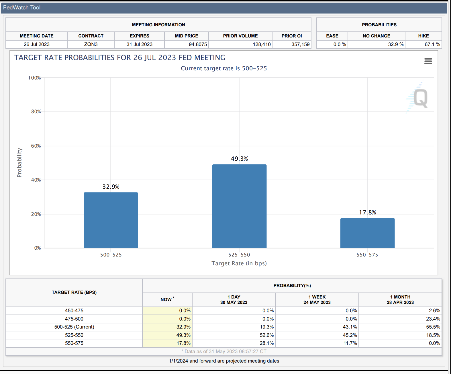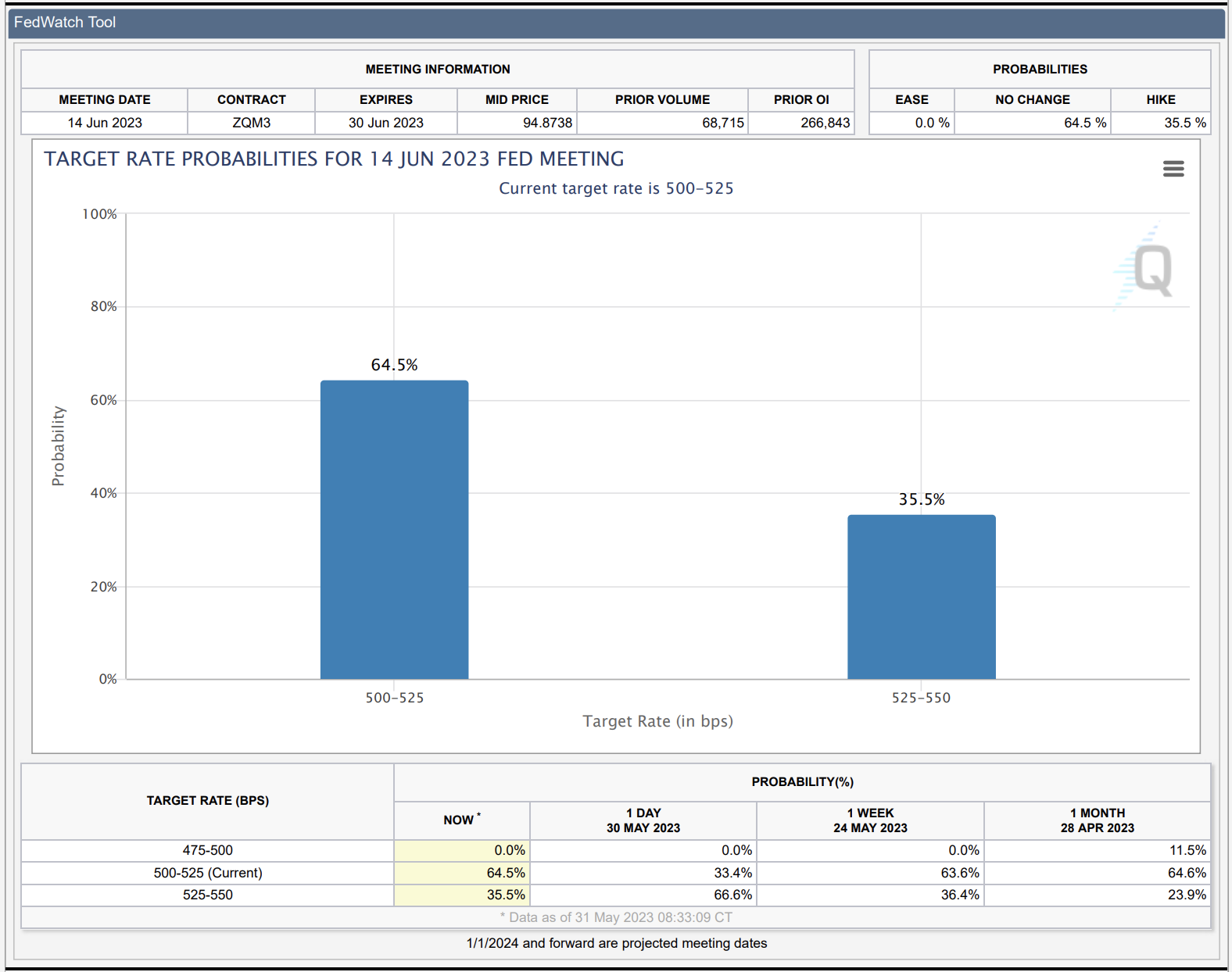 미국 기준금리 동결 가능성 점도표 2023년 6월 1일 한국기준 (자료: Fed watch)
