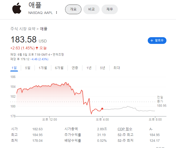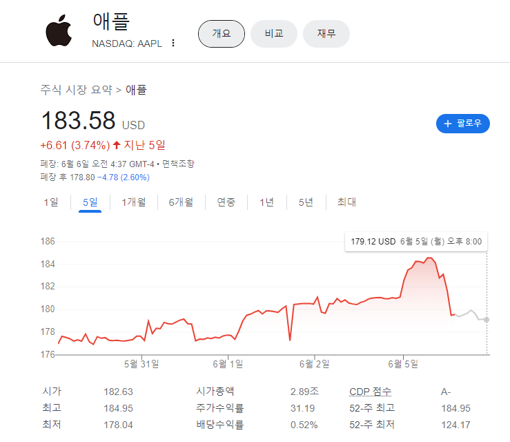 애플이 가상현실을 위한 465만원 가량 헤드셋 '비전 프로' 를 내놓았지만, 주가는 0.76% 하락했다. 이미 52주 신고가를 경신하면서 과하게 오른 상황에서 신제품의 범용 히트 가능성에 대한 의문이 제기되면서 주가는 약세를 보였다.