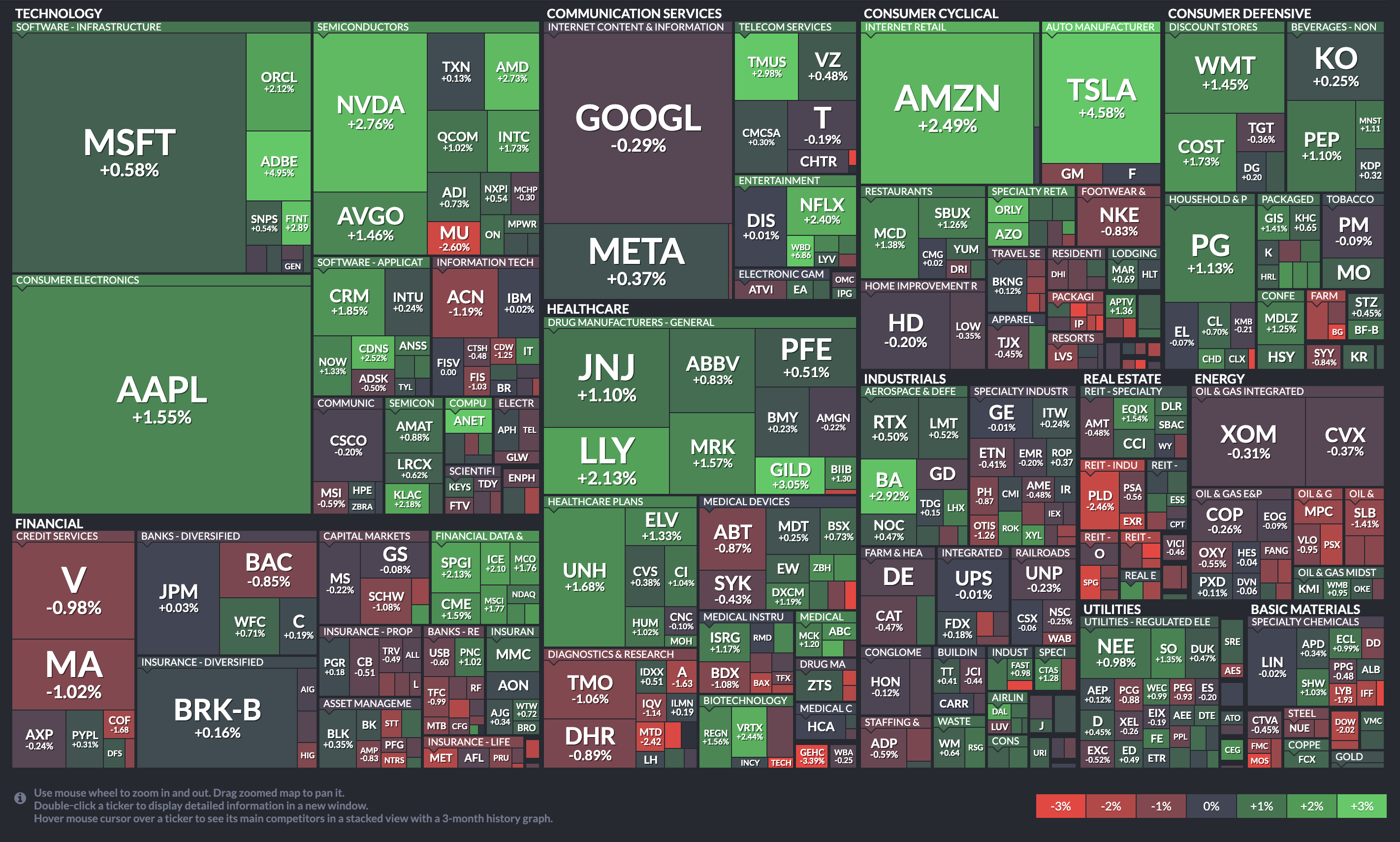 뉴욕증시는 기술주의 강세로 상승했다. S&P500지수는 전장보다 0.62% 상승한 4,293.93으로, 나스닥지수는 전장보다 1.02% 상승한 13,238.52로 마감했다. 이는 지난해 8월 이후 최고치를 경신했다. 다음 주 예정된 연방공개시장위원회(FOMC) 정례회의를 앞두고 재료 부재 속에서도 기술주에 대한 강세 모멘텀이 유지됐다. 하지만 투자자들은 다음 주 예정된 FOMC 정례회의를 기다리며 조심스러운 모습을 유지하고 있다. 이번 주식시장의 상승은 호재로 받아들일 수 있지만, 연준의 행보에 따라 주식시장이 하락할 가능성도 있다.