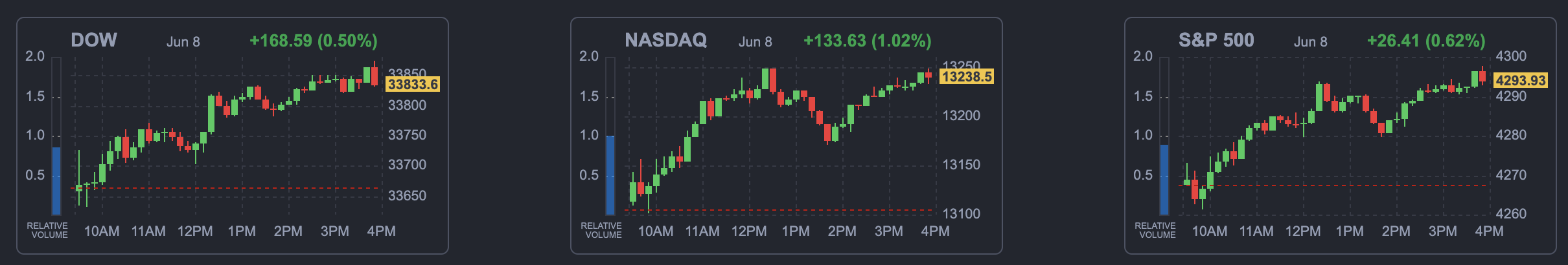 미국 증시 마감 시황 2023년 6월 9일 07:00기준 (미국시간 6월 8일 16:00 기준) (자료: 핀비즈)