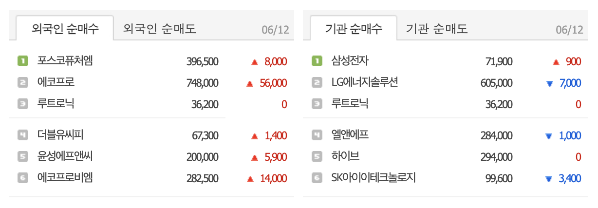 외국인 순매수와 기관 순매수 종목 (자료: 네이버증권)