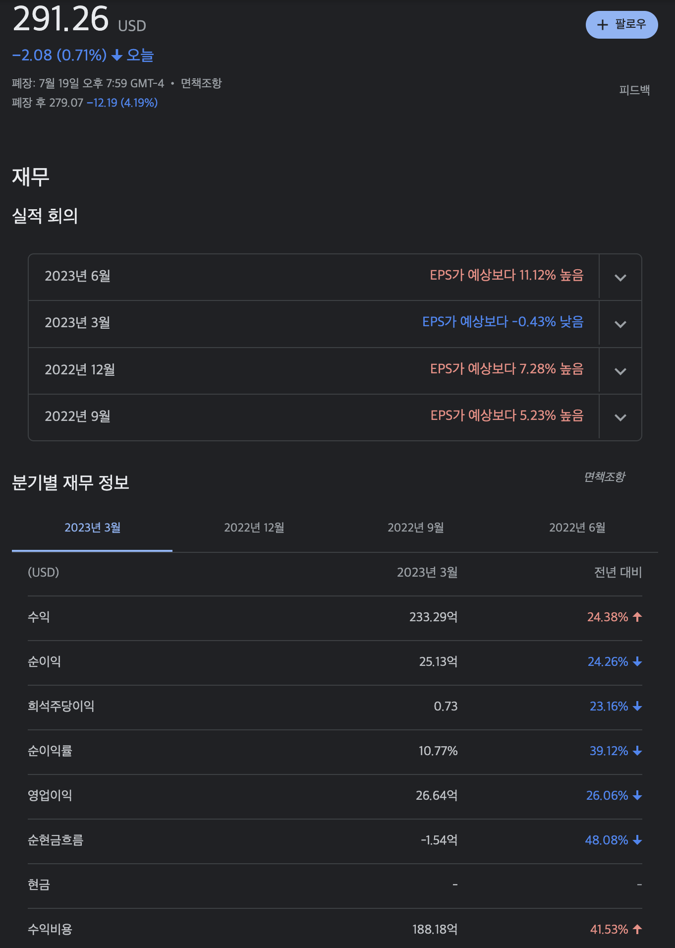 매출 24.93B(예측 24.29B) 주당순이익 0.91(예측 0.79)