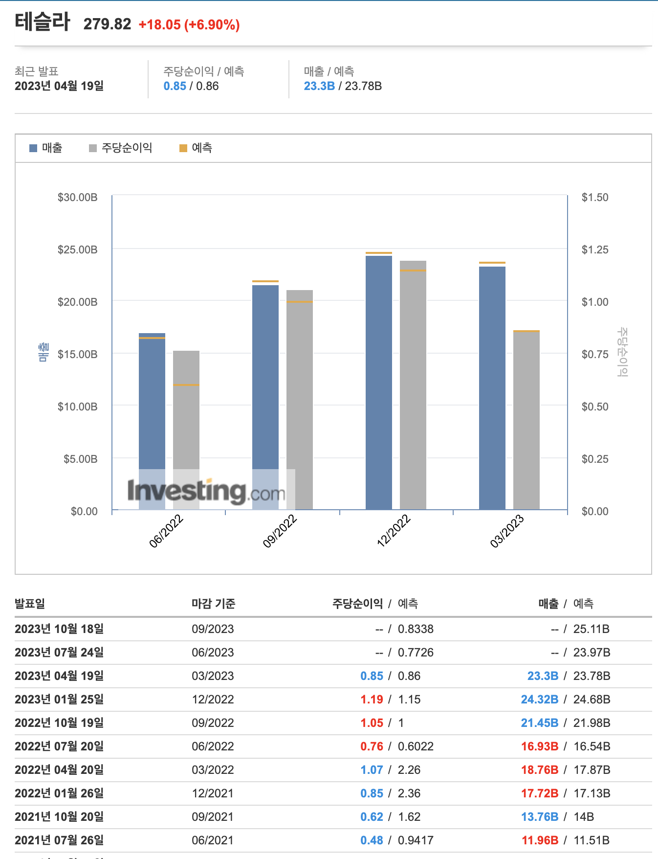 이전 시장 예측에 따라 테슬라 매출 예상액은 23.97B 이고, 주당순이익은 0.7726로 예상했었습니다.