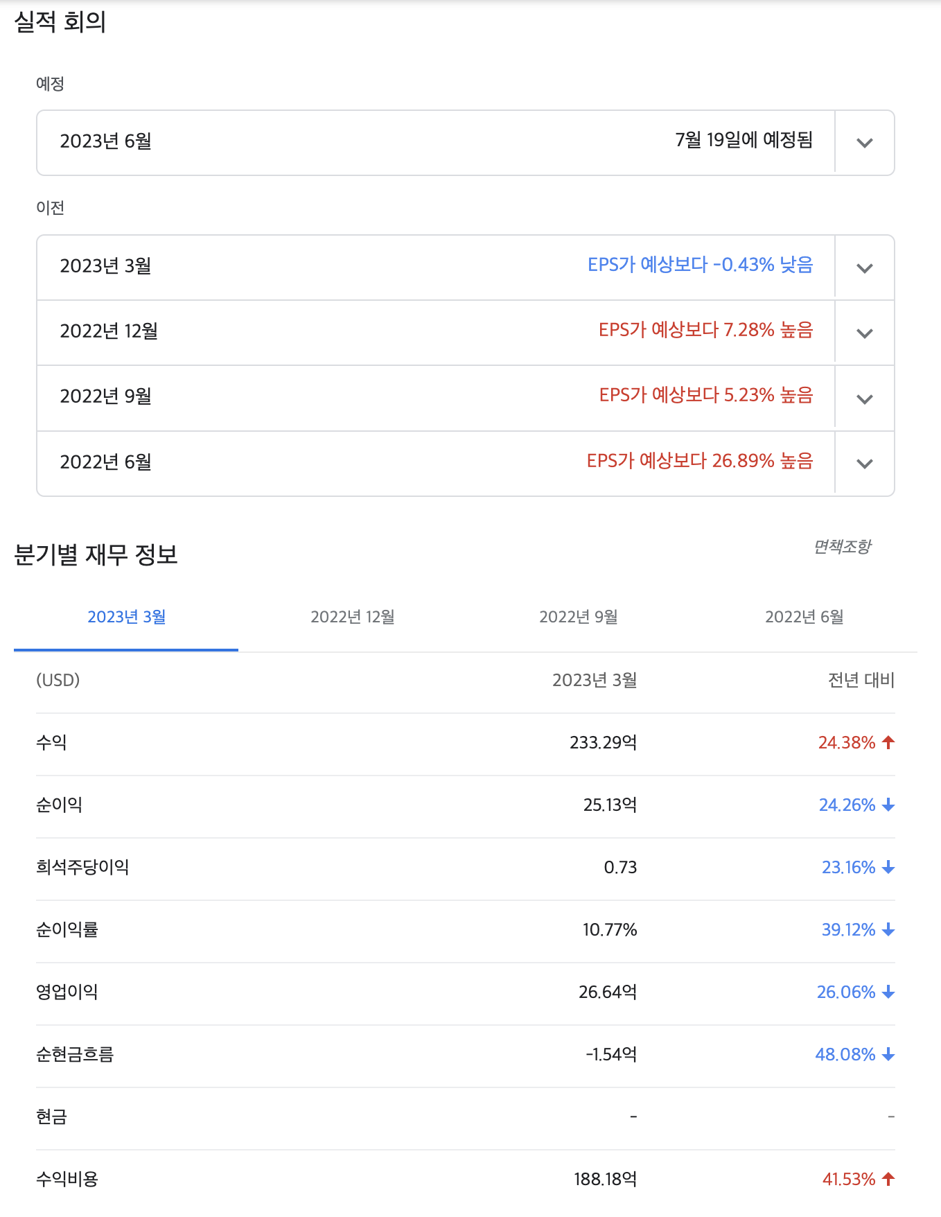 매출 24.93B(예측 24.29B) 주당순이익 0.91(예측 0.79)