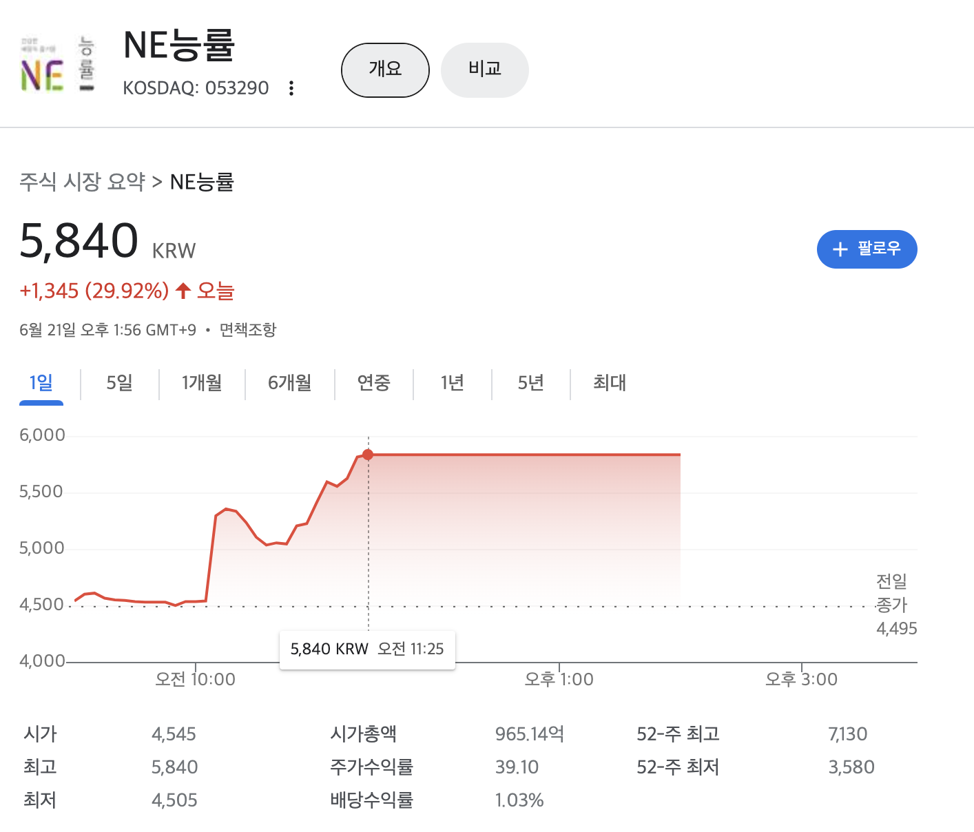 21일 오전 9시39분 기준 NE능률은 전 거래일 대비 0.89%(40원) 오른 4535원에 거래되고 있다가 오전 10시 10분 이후부터 급등세를 보이더니 11시 25분에 상한가로 진입해서 5,840원에 거래중이다.