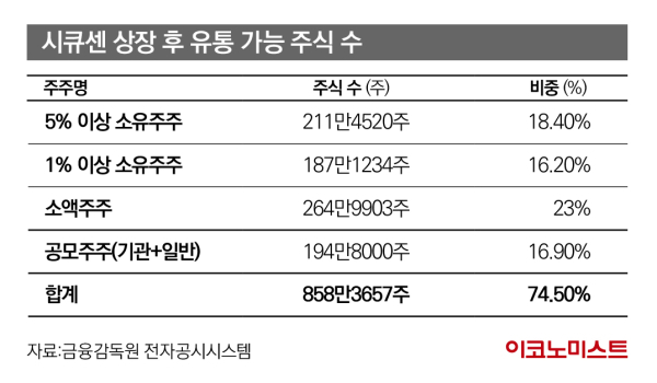 박종선 유진투자증권 연구원은 “시큐센은 이전상장으로 인해 상장 후 유통가능 물량은 전체 주식수의 74.5%(858만주)로 다소 부담스러운 수준”이라고 설명했다.