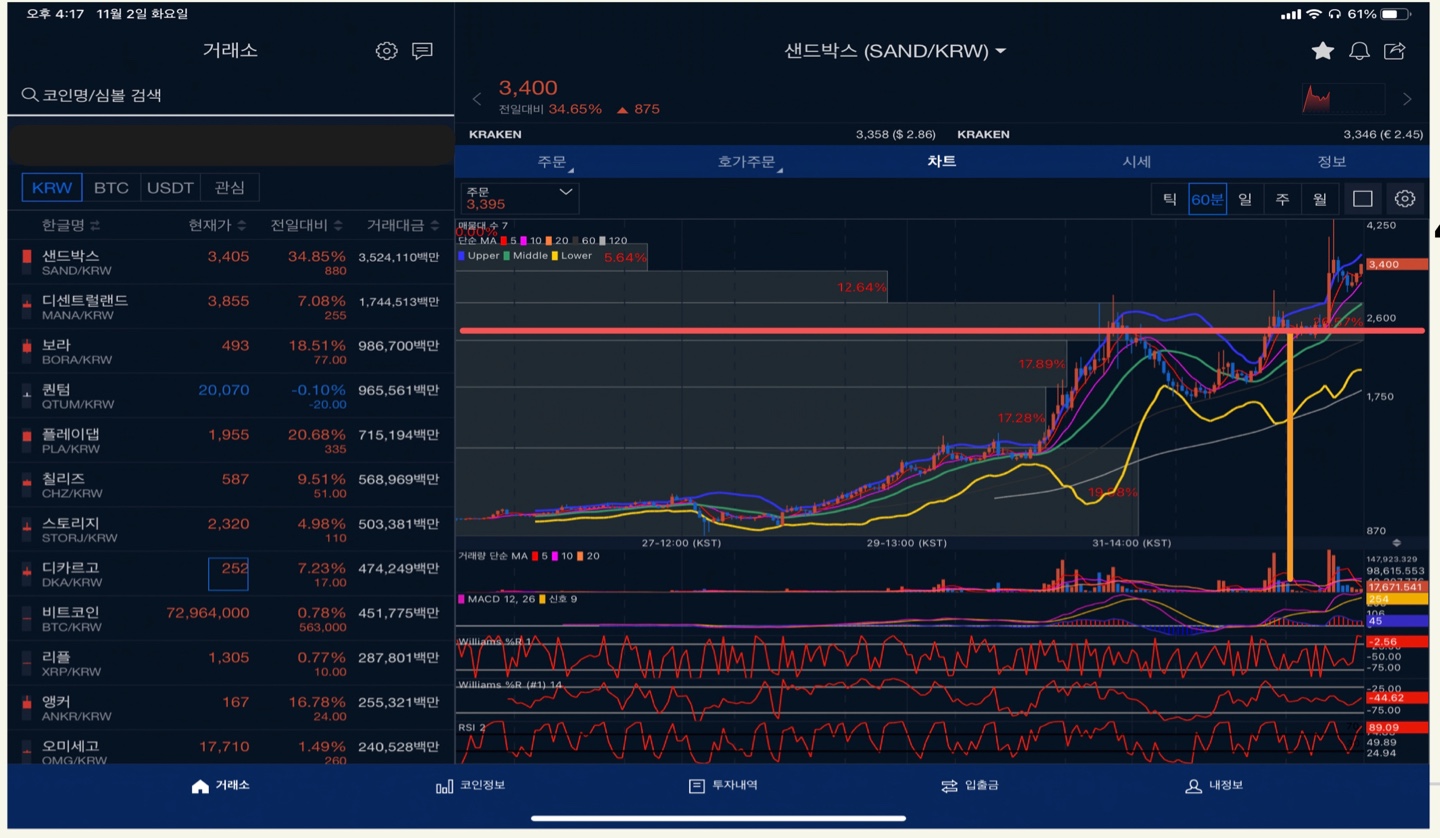 이날은 전일 대비 34.85% 이상 급등했던 이유가 코인 시장에 훈풀을 불어줄 코인거래 투자 소식이 나왔던것이 핫 이슈가 되어 샌드박스(SAND)가 실시간 급 상승 종목으로 뛰었다.