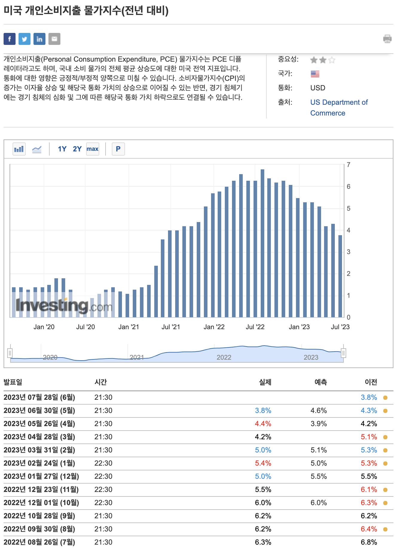 - 미국 개인소비지출물가지수 PCE: 4.3% --> 3.8%(예측 4.6%)