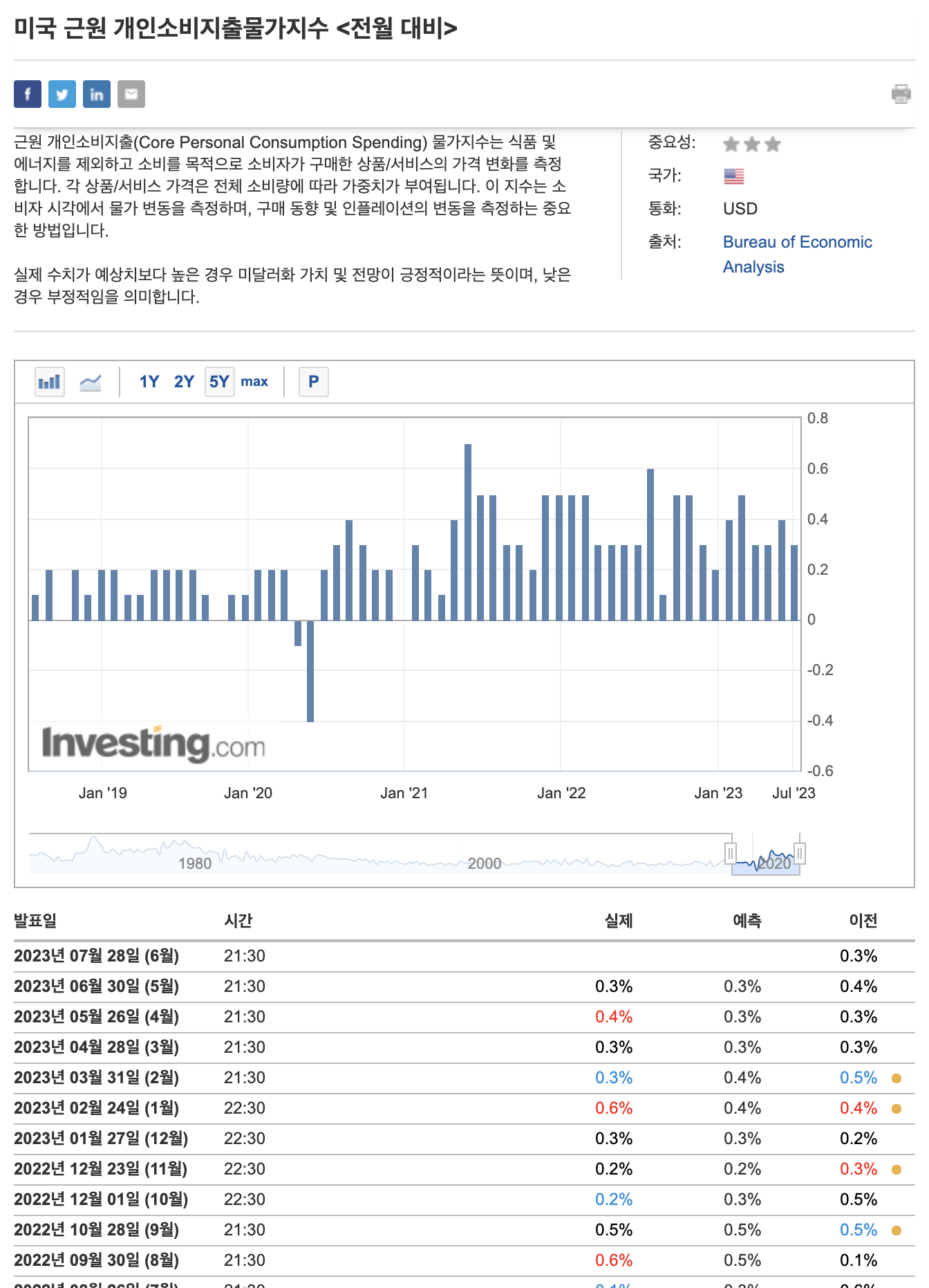 - 미국 근원개인소비지출물가지수 PCE: 0.4% --> 0.3%(예측 0.3%)