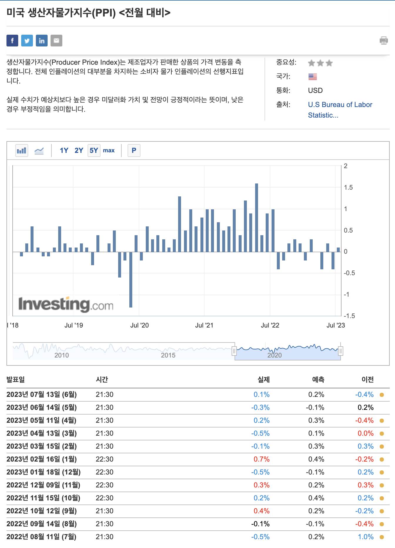 - 미국 생산자물가지수 PPI: 0.9% --> 0.1%(예측 0.4%)