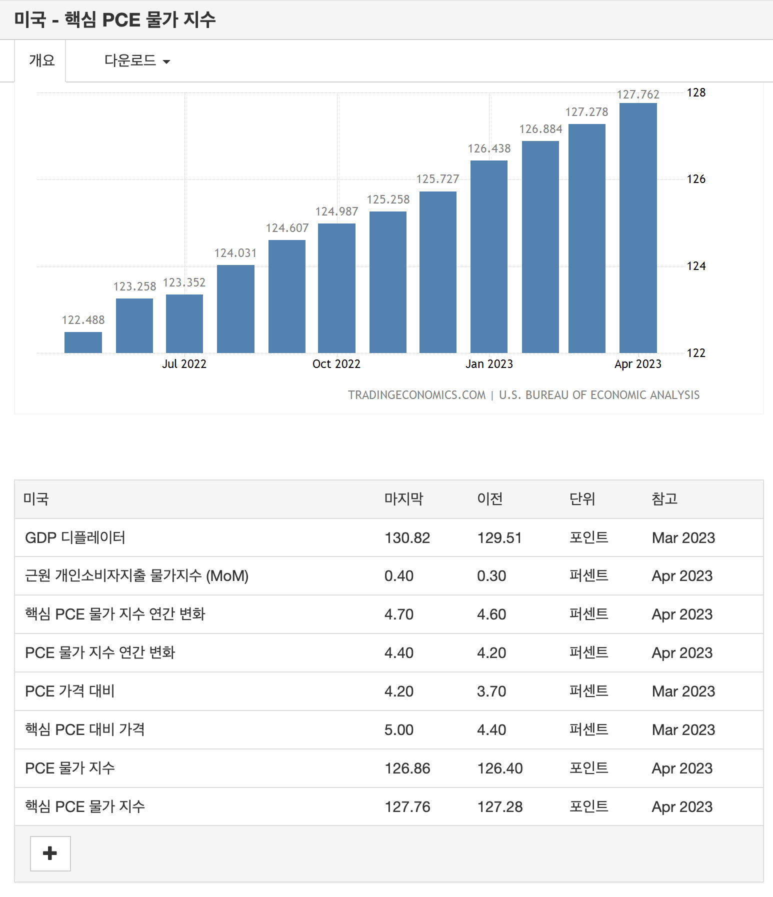 - 미국 근원개인소비지출물가지수 PCE: 4.6% --> 4.7%(예측 4.6%)