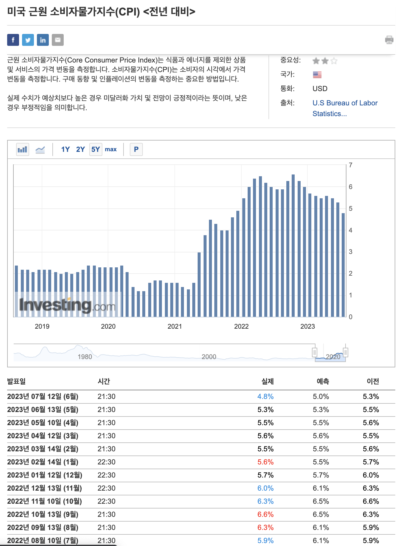 - 미국 근원소비자물가지수 CPI: 5.3% --> 4.8%(예측 5.0%)