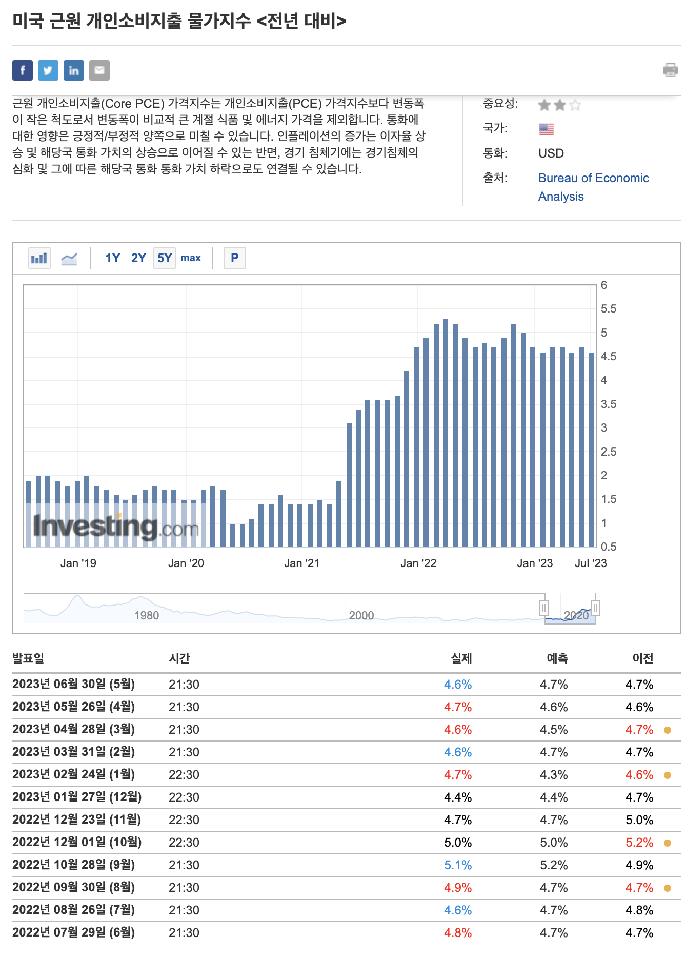- 미국 근원개인소비지출물가지수 PCE: 4.6% --> 4.7%(예측 4.6%)