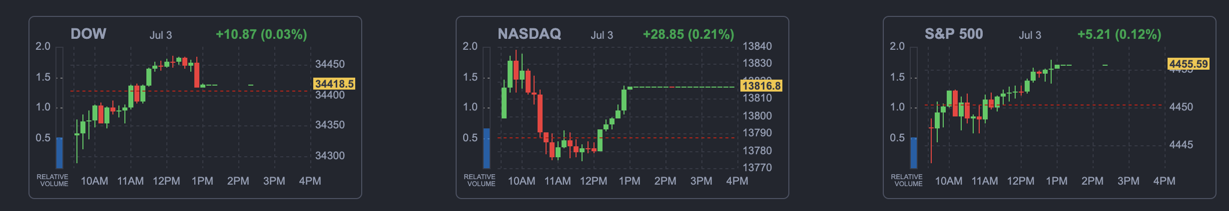 미국 증시는 강보합으로 거래를 마감했다. 다우존스30산업평균지수는 10.87포인트(0.03%) 오른 3만4418.47에, S&P500지수는 5.21포인트(0.12%) 높은 4455.59에, 나스닥지수는 28.85포인트(0.21%) 상승한 1만3816.77을 기록했다.