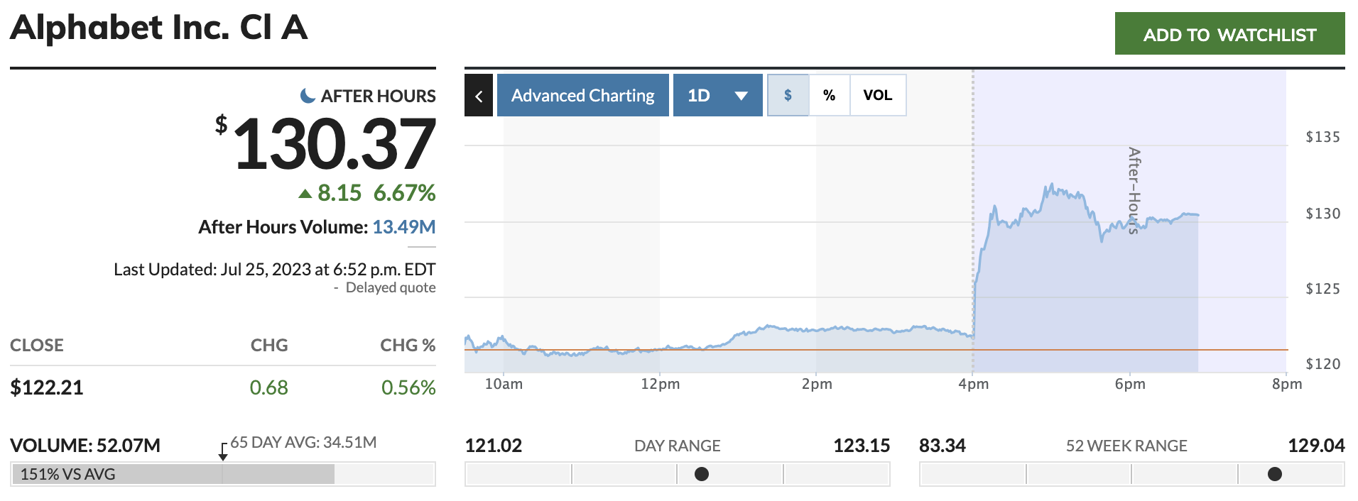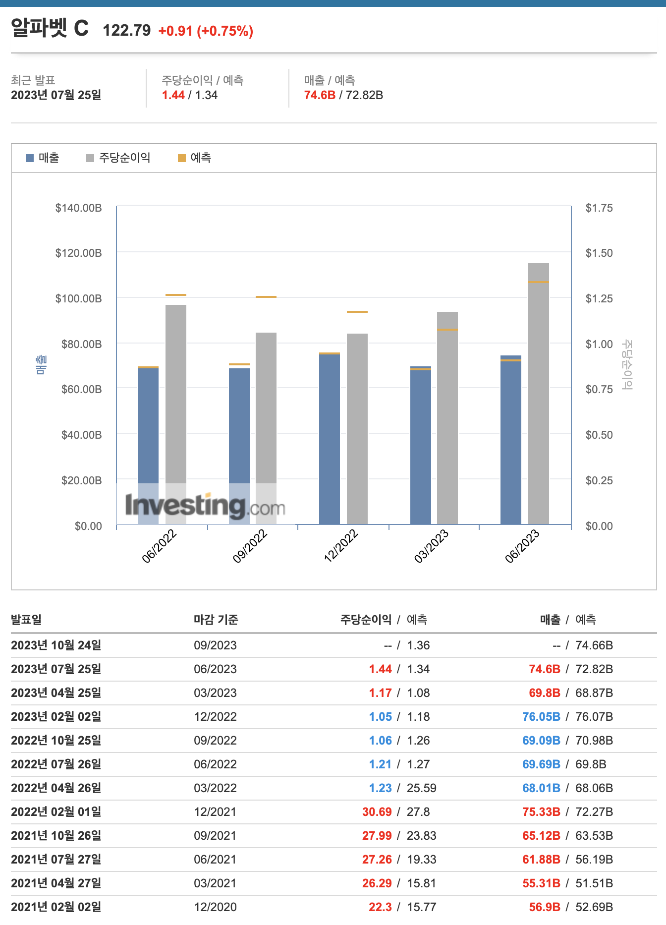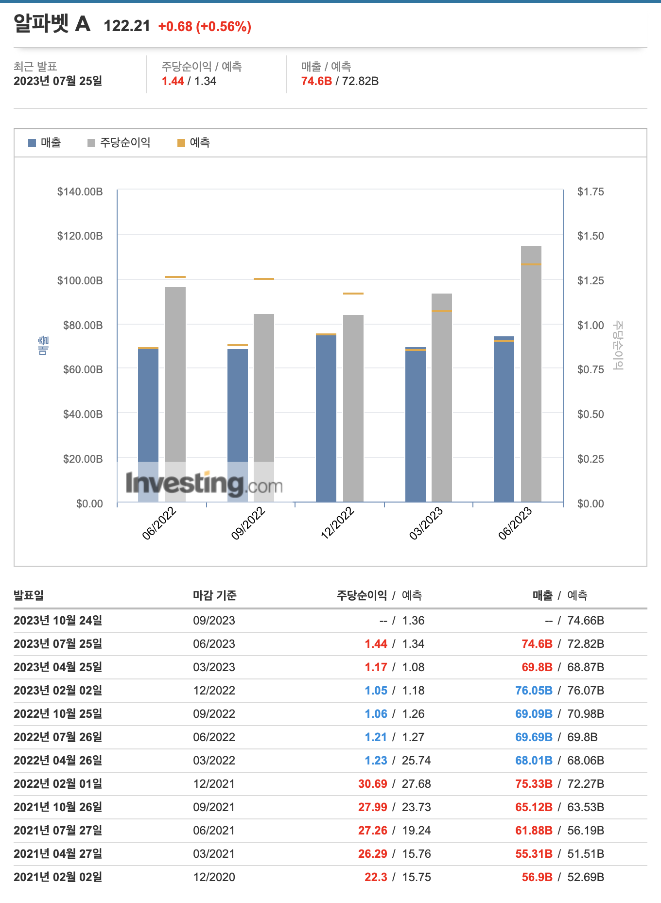 | 구글(알파벳A) | 7월 25일 | 69.8B | 746B(72.8B) | 1.17 | 1.44(1.34) |
