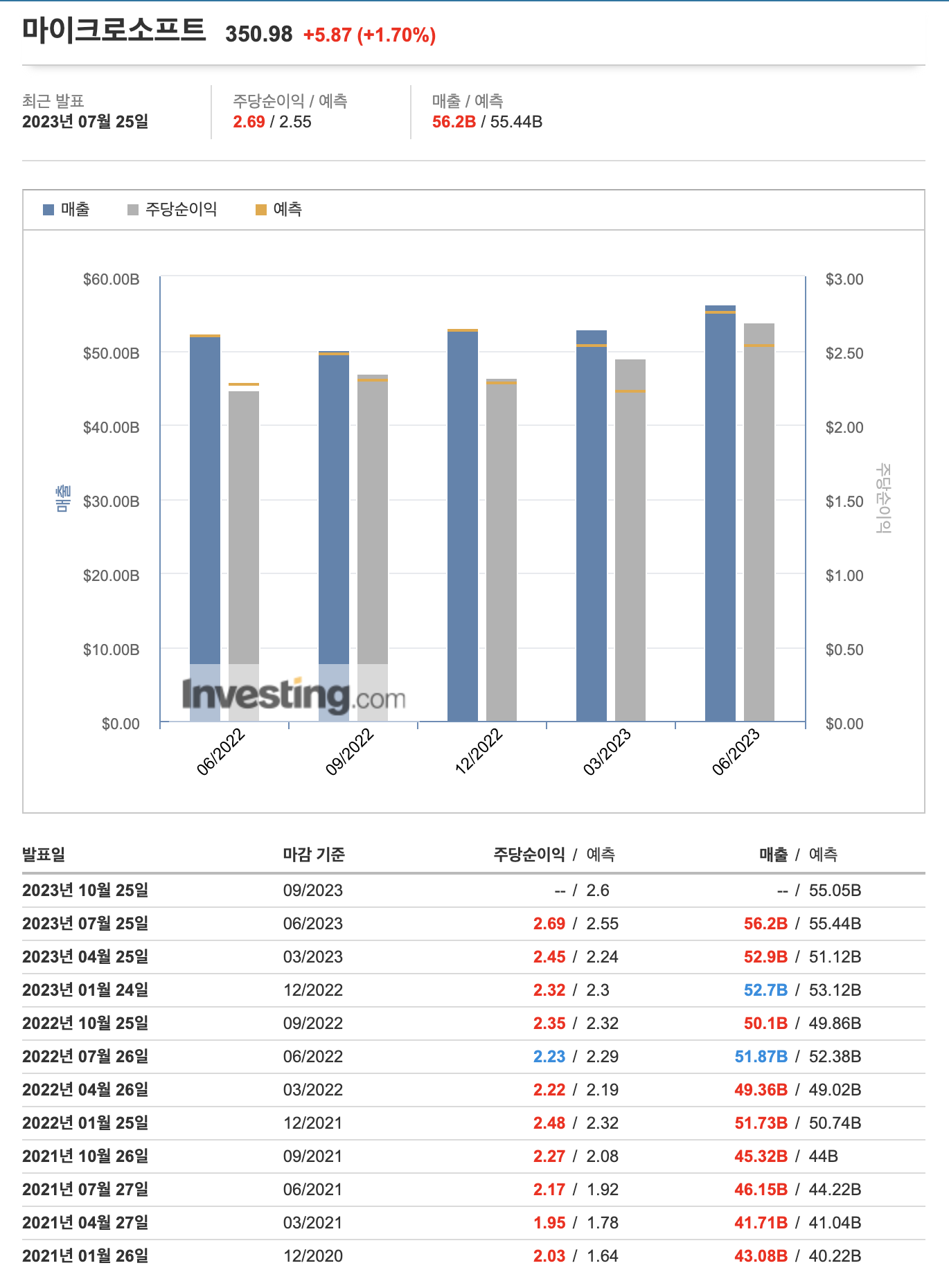 | 마이크로소프트 | 7월 25일 | 52.9B | 56.2B(55.41B) | 2.45 | 2.69(2.55) |
