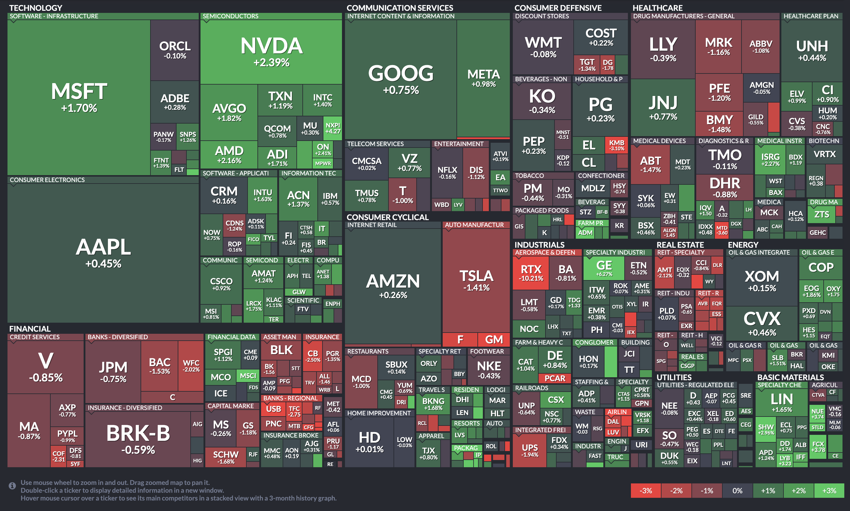 기술주가 상승했다. 애플 0.45%, 마이크로소프트 1.7%, 아마존 0.26%, 알파벳 0.56%, 엔비디아 2.39%, 메타 0.98% 상승했다. 반면 넷플릭스는 0.16% 소폭 하락했다.