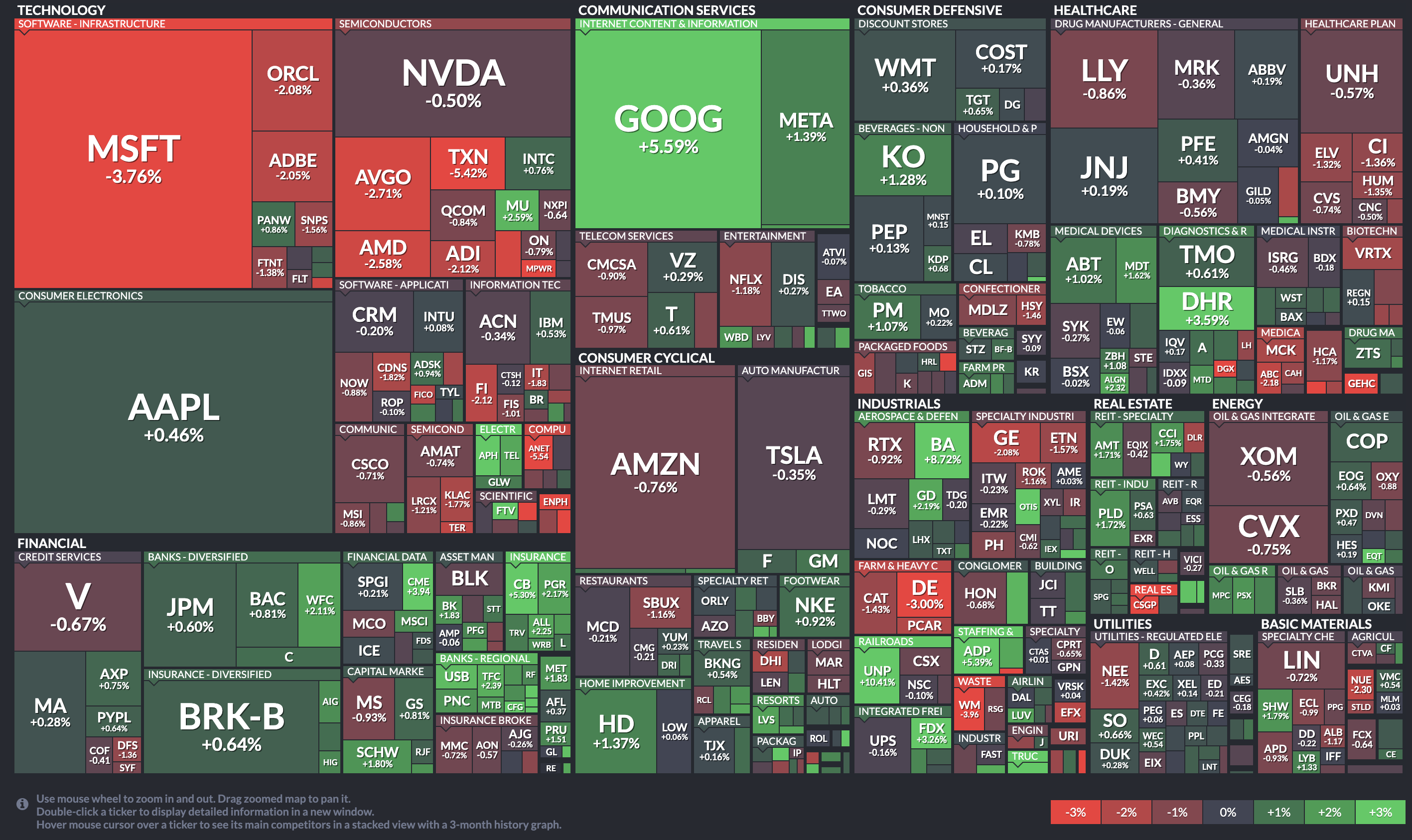 기술주가 엇갈렸다. 애플 0.45%, 메타 1.39%, 알파벳 5.78% 올랐으나 마이크로소프트 3.76%, 넷플릭스 1.18%, 아마존 0.76%, 엔비디아 0.5% 하락했다.