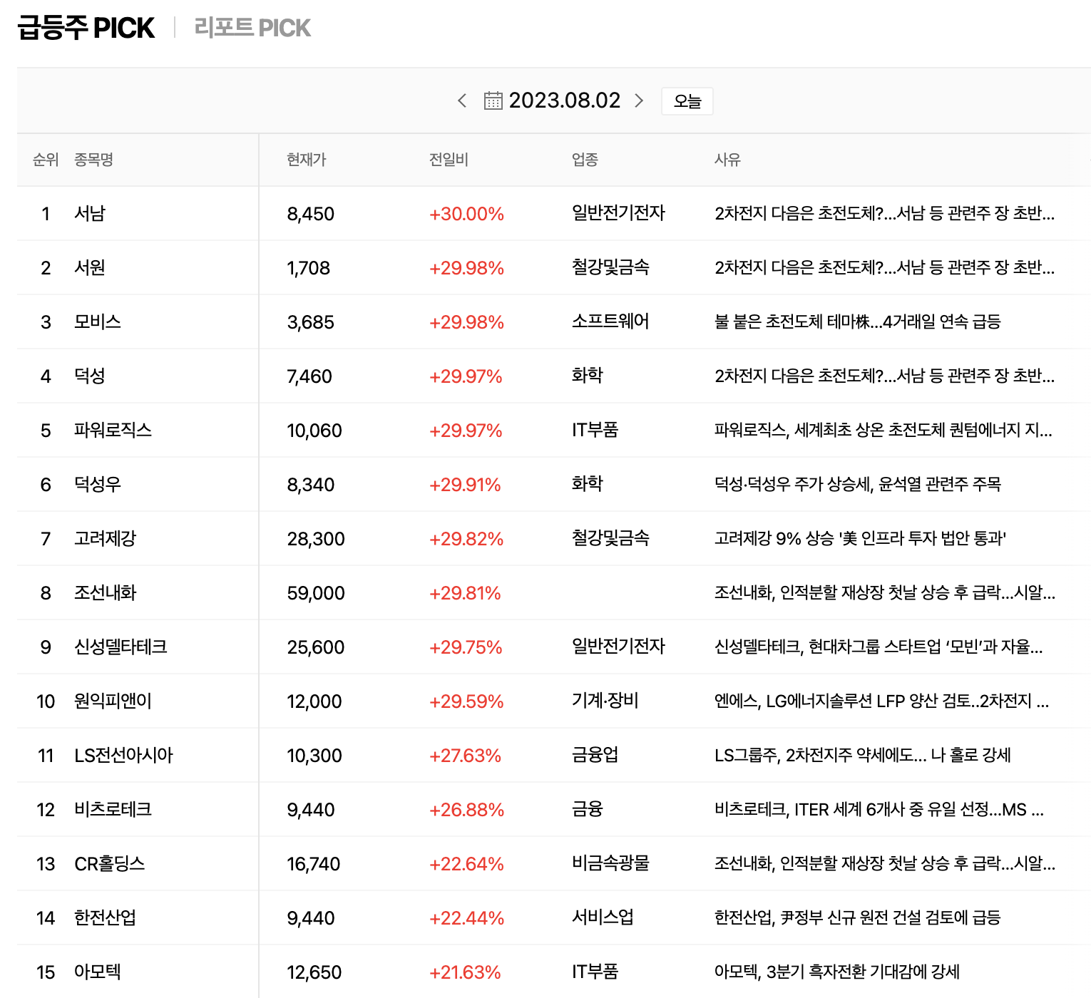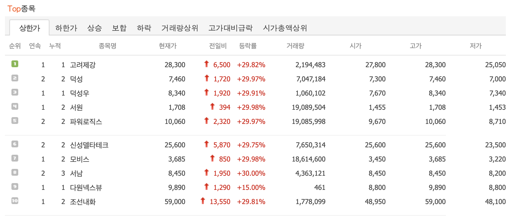 서남은 전날에 이어 개장하자마자 상한가로 직행하면서 연중 최고치를 경신했다. 덕성(29.97%), 신성델타테크(29.75%)도 마찬가지다. 서원(29.98%), 모비스(29.98%), 고려제강(29.82%)도 장중 상한가를 기록했다.