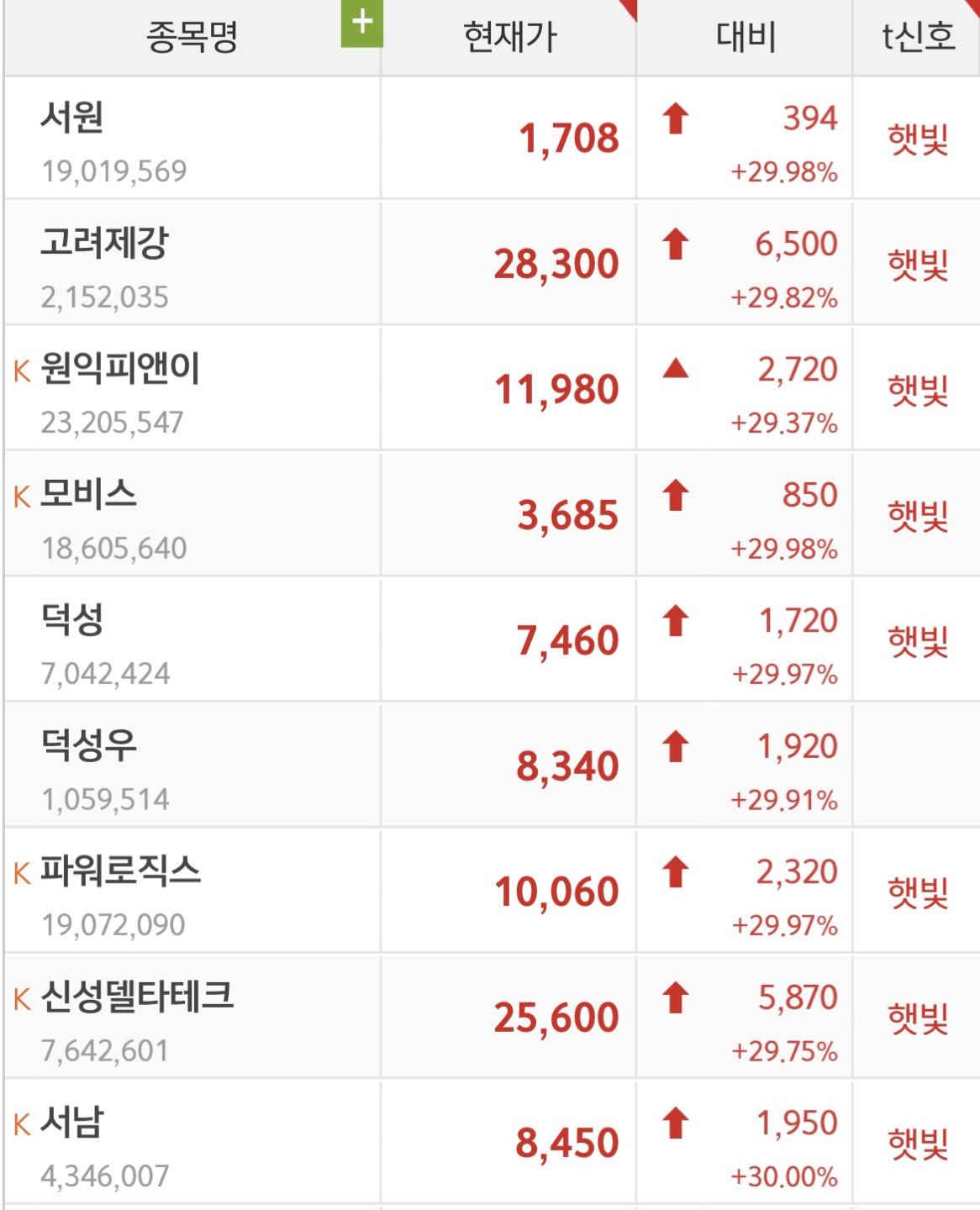 서남은 전날에 이어 개장하자마자 상한가로 직행하면서 연중 최고치를 경신했다. 덕성(29.97%), 신성델타테크(29.75%)도 마찬가지다. 서원(29.98%), 모비스(29.98%), 고려제강(29.82%)도 장중 상한가를 기록했다.