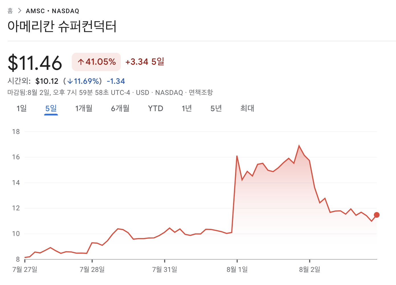 마켓워치는 “한국 연구진이 상온·상압 초전도체를 발견했다고 주장하며 초전도체 기술이 많은 관심을 받고 있다”고 AMSC 주가 급등 요인을 설명했다. 송전·배전 등 전력 솔루션을 주력으로 하는 AMSC는 과거부터 초전도체를 연구한 선도기업으로 꼽힌다. ‘초전도체 테마주’로 꼽히면서 ‘서학 개미’ 투자금이 AMSC에 급격히 몰려들었다.