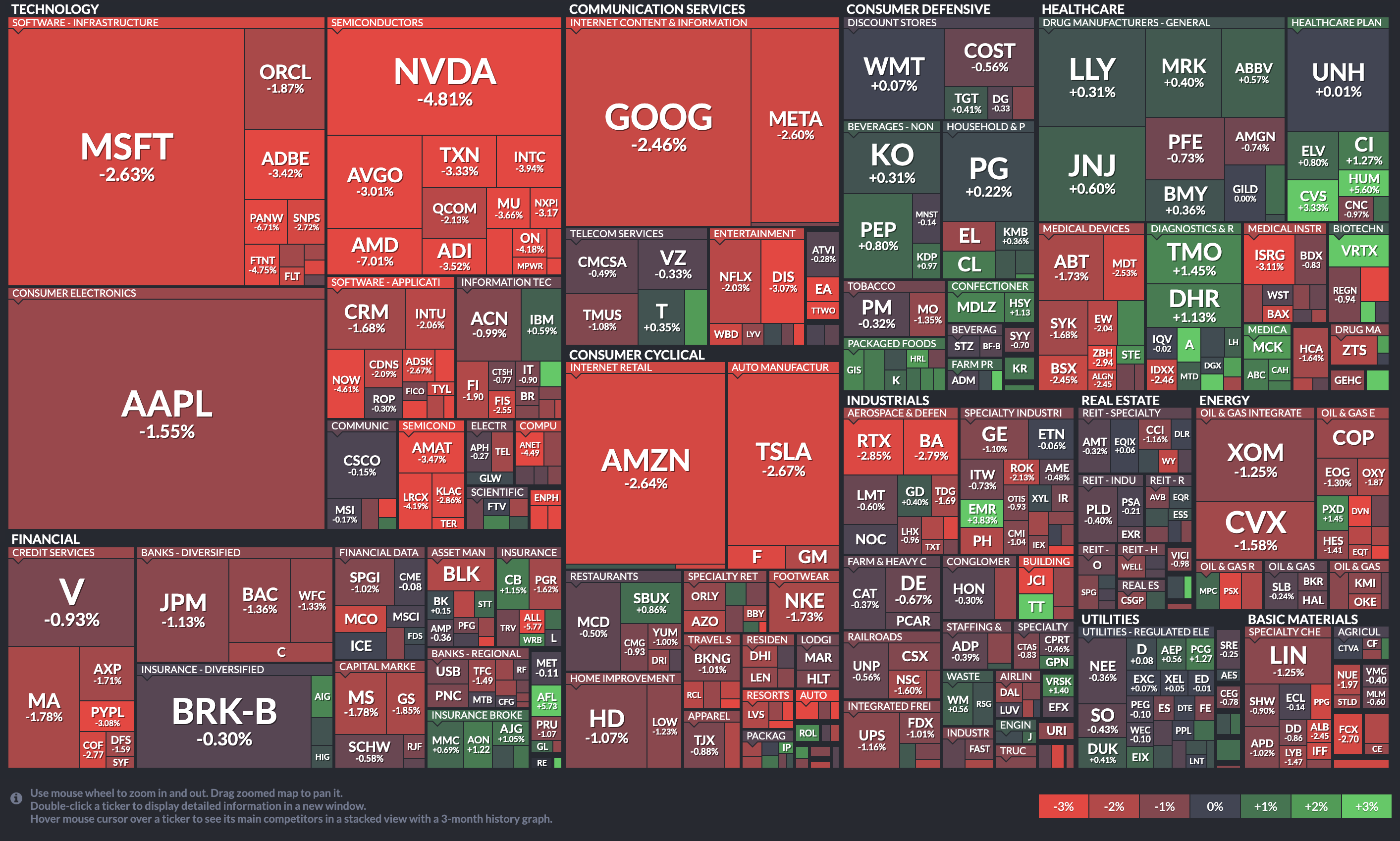 기술주가 하락했다. 애플 1.55%, 마이크로소프트 2.63%, 아마존 2.64%, 엔비디아 4.81%, 넷플릭스 2.03%, 알파벳 2.41%, 메타 2.6% 하락 마감했다. AMD는 예상치를 웃돈 실적에도 7.02% 내렸다.