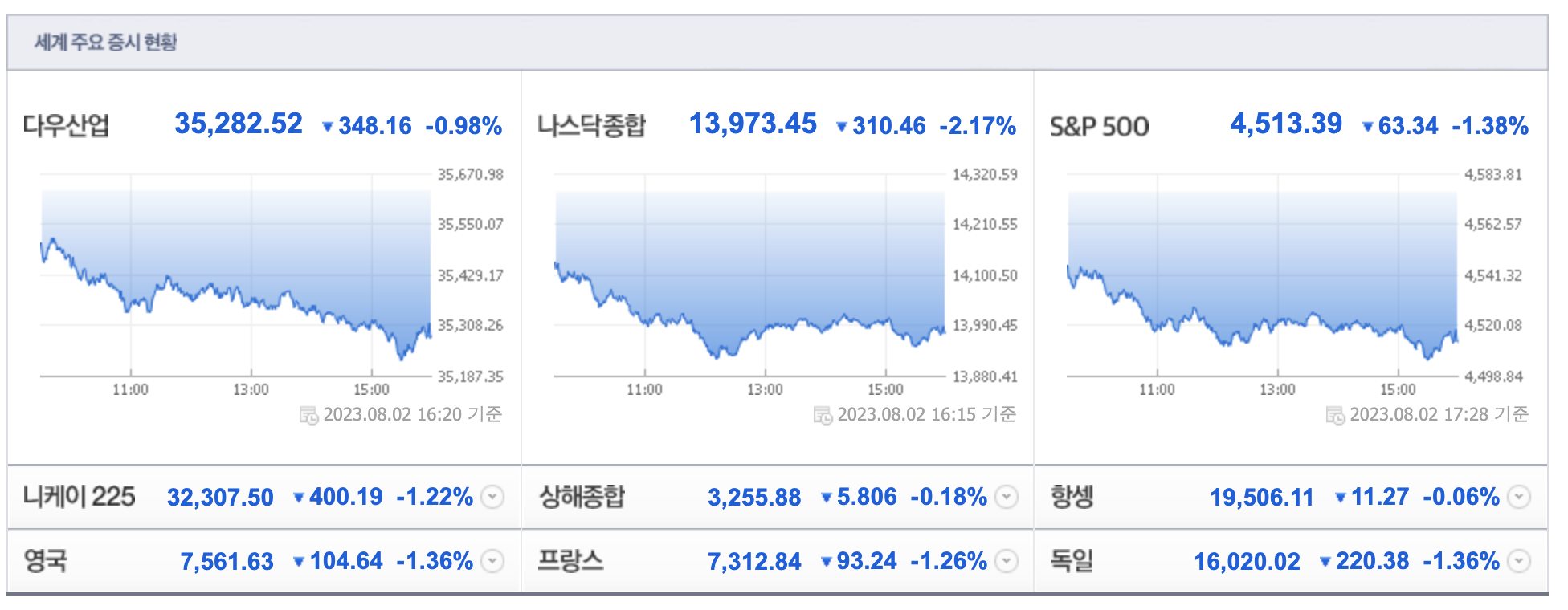 💠 미국 신용등금 강등여파...환율 상승에도 주식시장은 불안정한 상태 [날짜: 20230803]