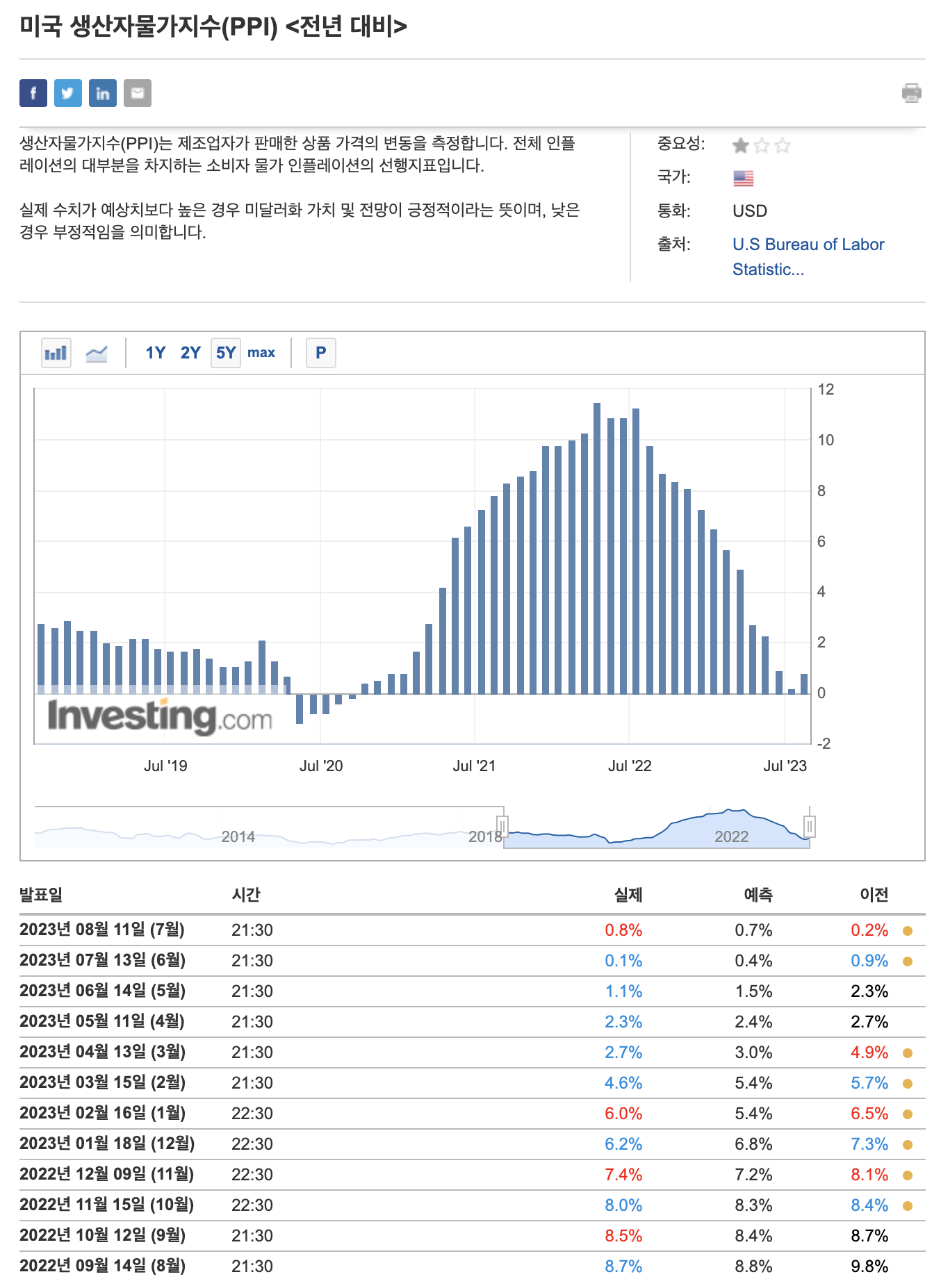 - PPI 8월(7월) : 0.2% --> 0.8%(예측 0.7%)