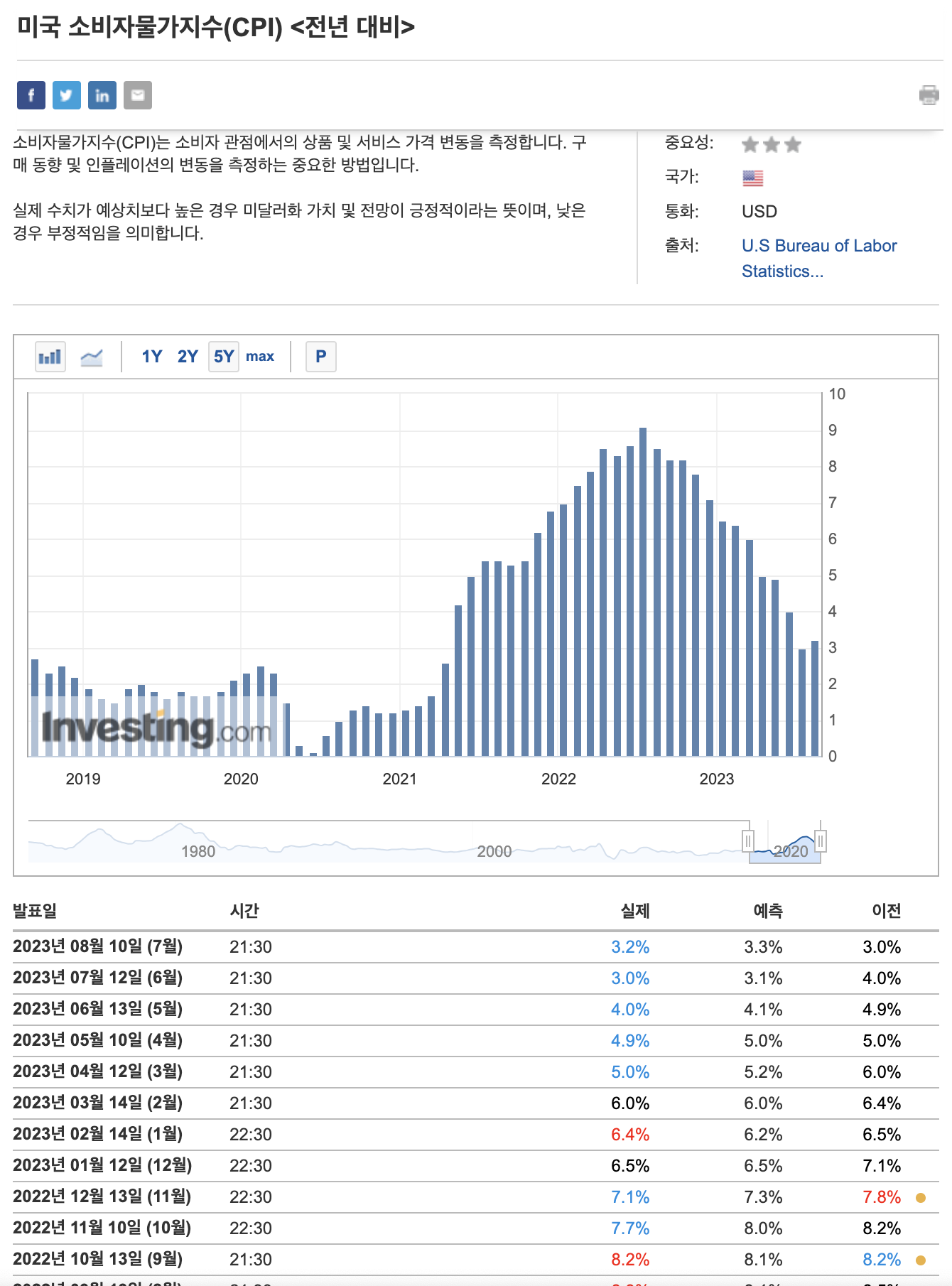- CPI 8월(7월) : 3.0% --> 3.2%(예측 3.3%)