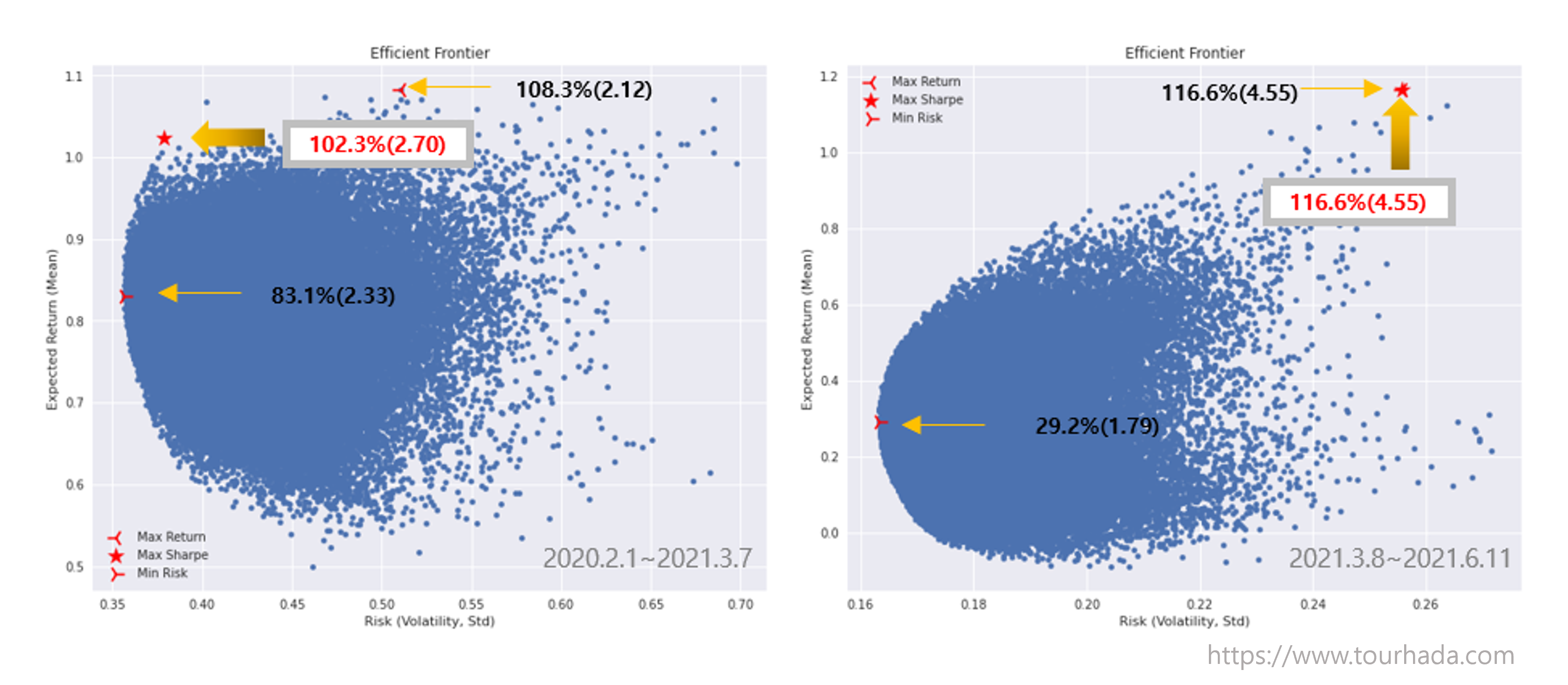 결과적으로, 투자 전 포트폴리오 작성(2020.2.1 ~ 3.7) 했을때 최적 수익률 102.3%(SR 2.70)에 비해 실제 투자 기간(2021.3.8 ~ 6.11)에 최적 수익률 116.6%(SR 4.55)로 훨씬 결과가 좋게 나온 것을 알 수 있다.